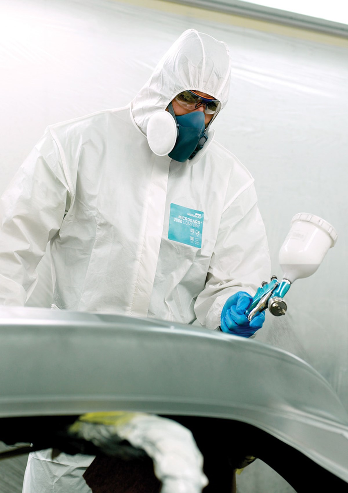 Kemskyddsdräkt AlphaTec 2000 Comfort 2000, typ 5,6 dräkt, med PE-laminerat material på framsidan och SMS-material på ryggen, för bättre andningsbarhet. Lämpar sig utmärkt för användning inom sprutlackering, glasfiberhantering, livsmedelsindustrin, läkemedelsindustrin och där det krävs en vätsketät framsida.