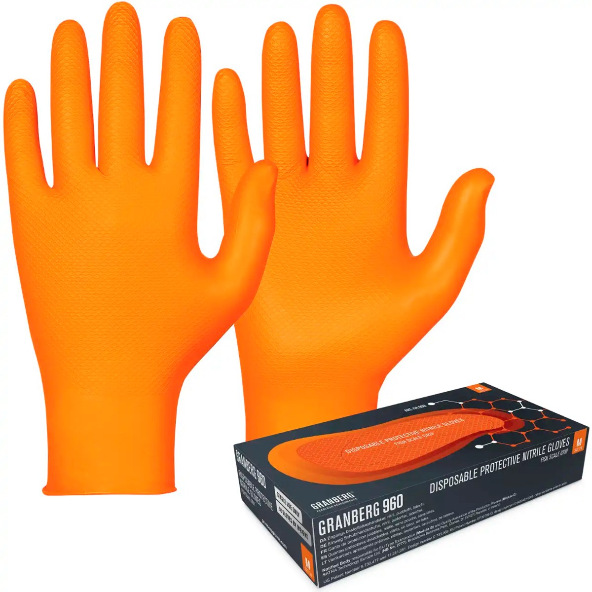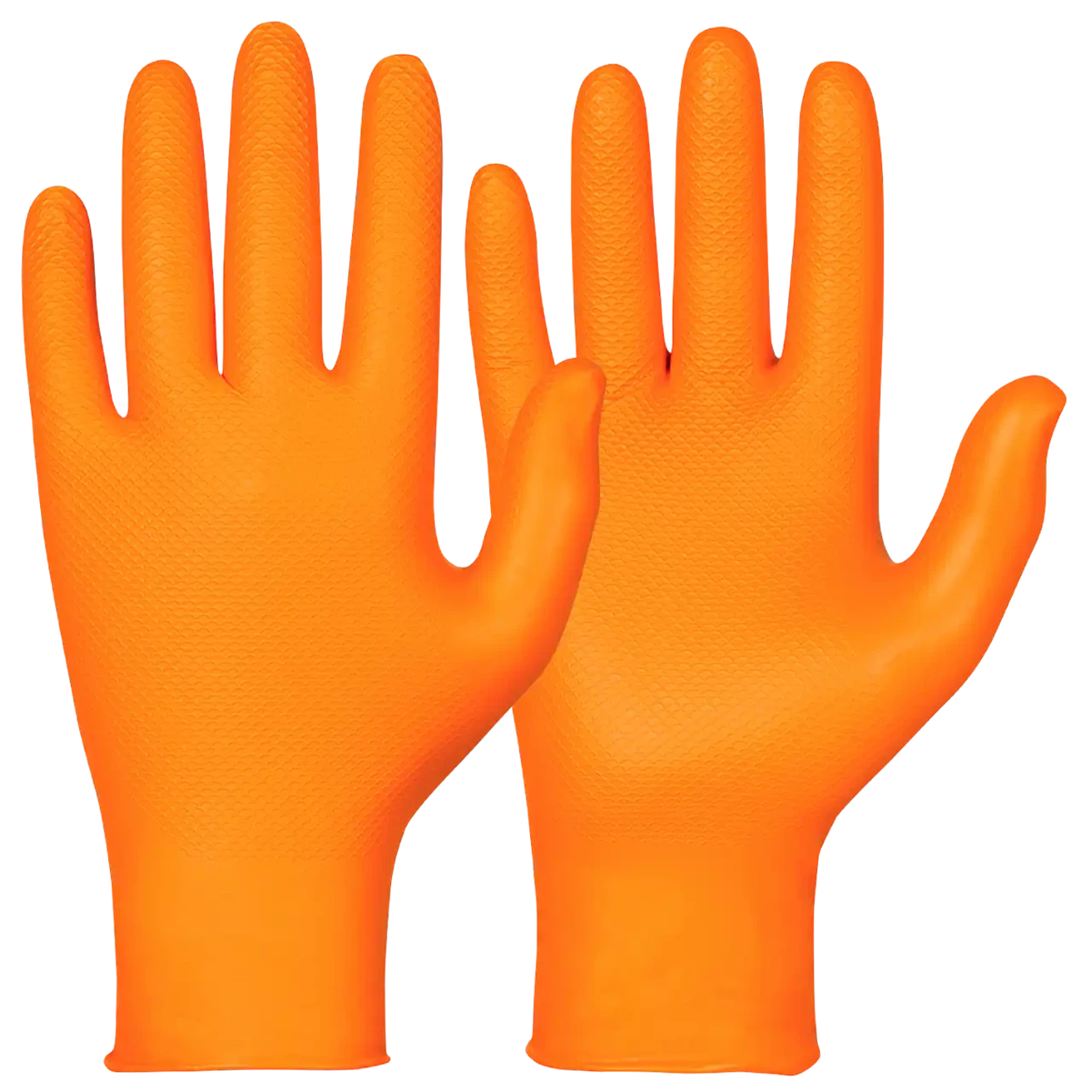 Orangea engångshandskar som tål tuffa tag! Extra kraftiga och med ett fiskfjällsmönster på hela handen som ger ett fantastiskt grepp, tex för dig som arbetar i oljiga miljöer. Godkända för såväl livsmedelshantering som kemikaliehantering.