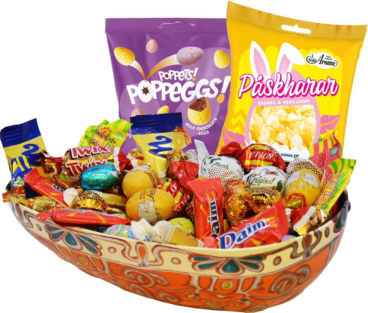 Fyllda med en utsökt mix av: • Werthers Original Creamy Filling • Werthers Original Toffee • Twix • Daim • Marabou Nougat Crisp • Refreshers mix • Nötcréme Org Kulor • Rollo Engelsk Kola • Folierade påskägg choklad/nougat • 1 påse Poppeggs • 1 påse Aroma Påskharar