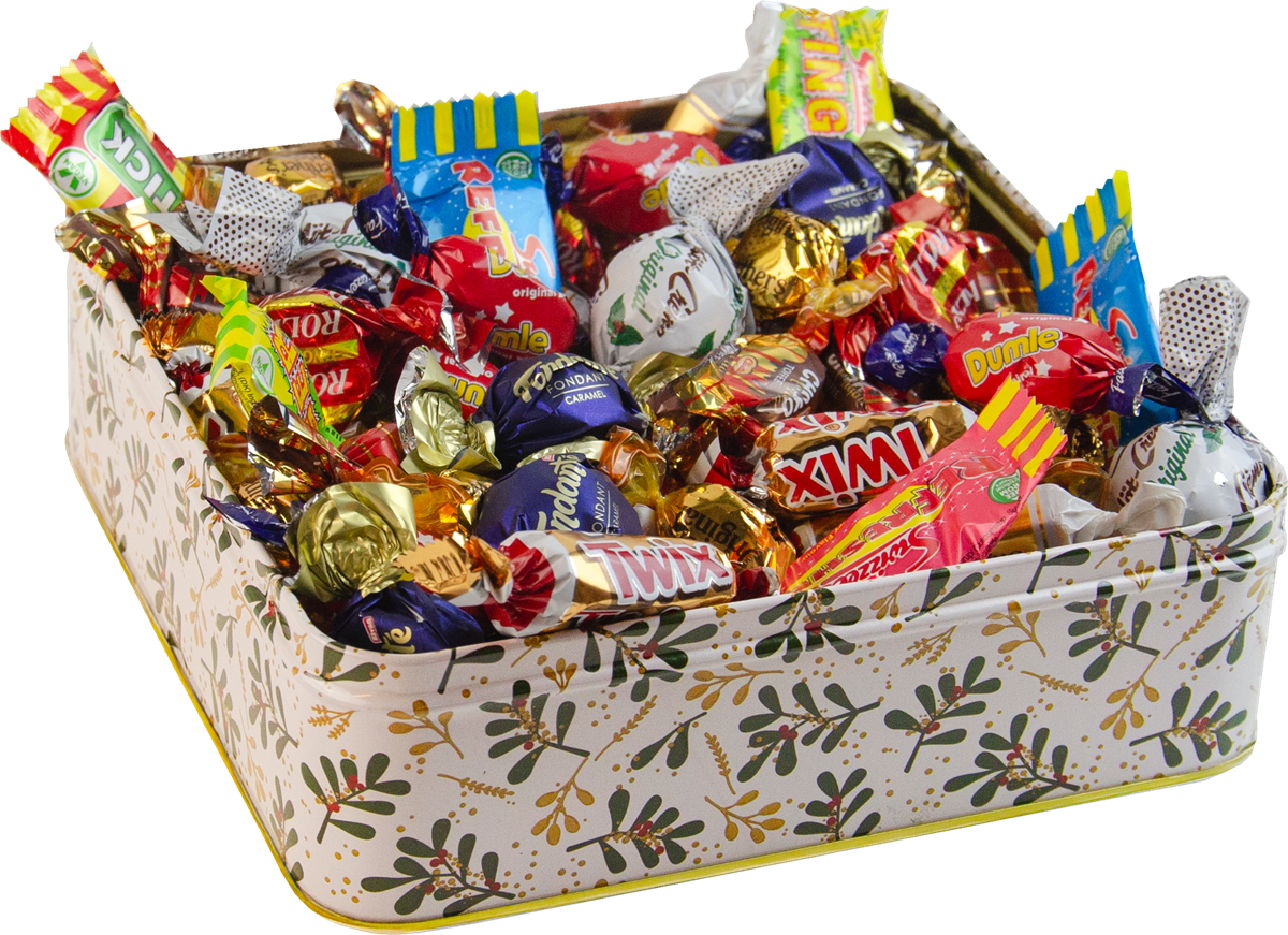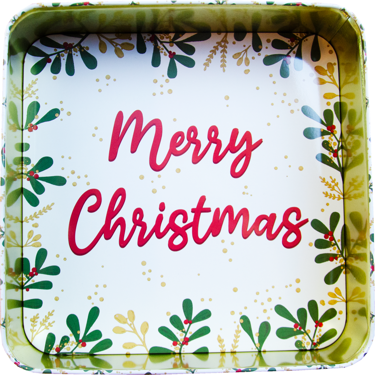 Julig dekorativ plåtlåda med ett fönster som visar det goda innehållet. När det goda tar slut finns där en trevlig julhälsning i botten.
