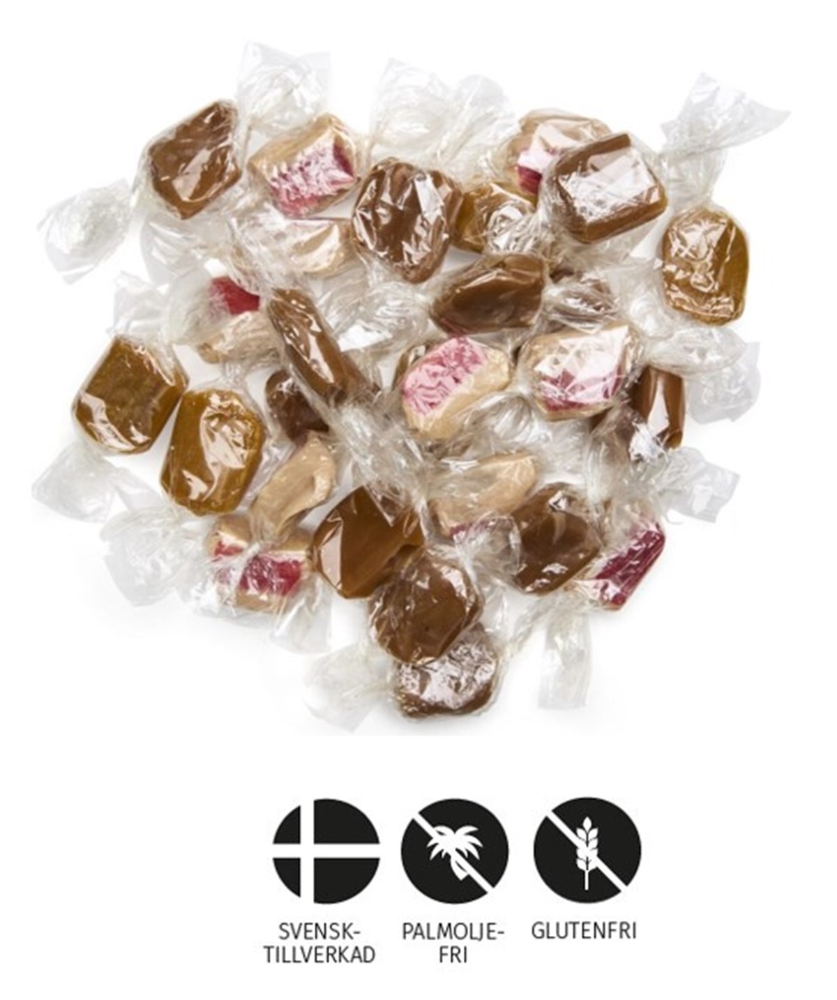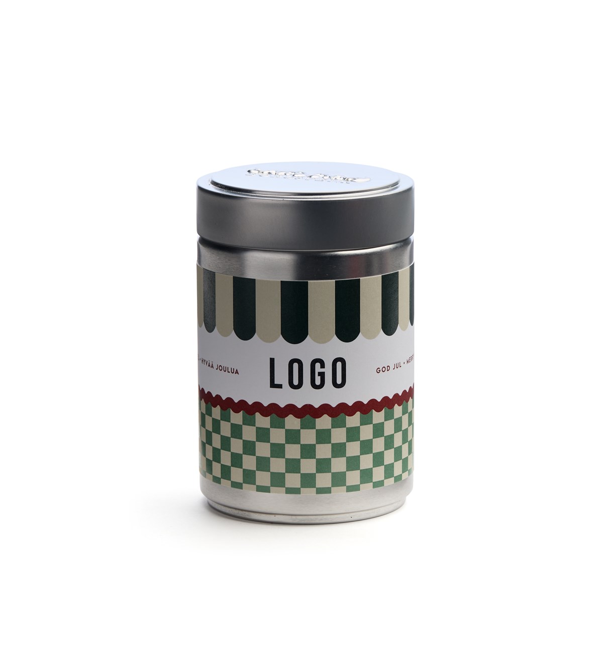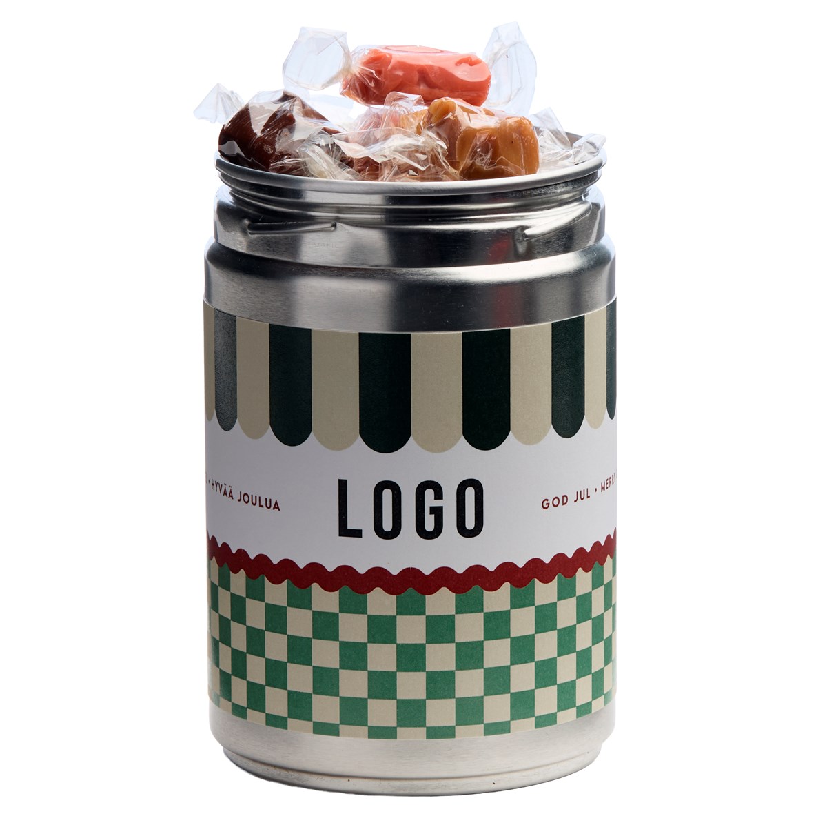 En praktisk konservburk med skruvlock, fylld med 250 g svensk julkola i smakerna pepparkaka, julskum, saffran och choklad. Glutenfri och svensktillverkad. Tryck din logga eller ditt budskap på produkten. Vattenbaserade färger.