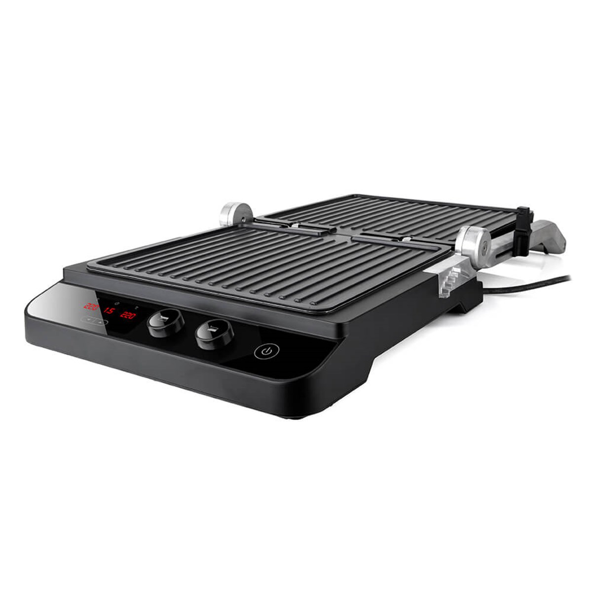 Topplattan som anpassar sig efter matens tjocklek och med 180º öppning kan laga dubbelt så mycket mat samtidigt. Snabb, jämn tillagning tack vare dess effekt på 2000 W och ett värmesystem i direktkontakt med plattorna. Varje platta har en oberoende temperaturregulator och timer för att få bästa resultat och du styr tillagningen från grillens LCD -skärm.