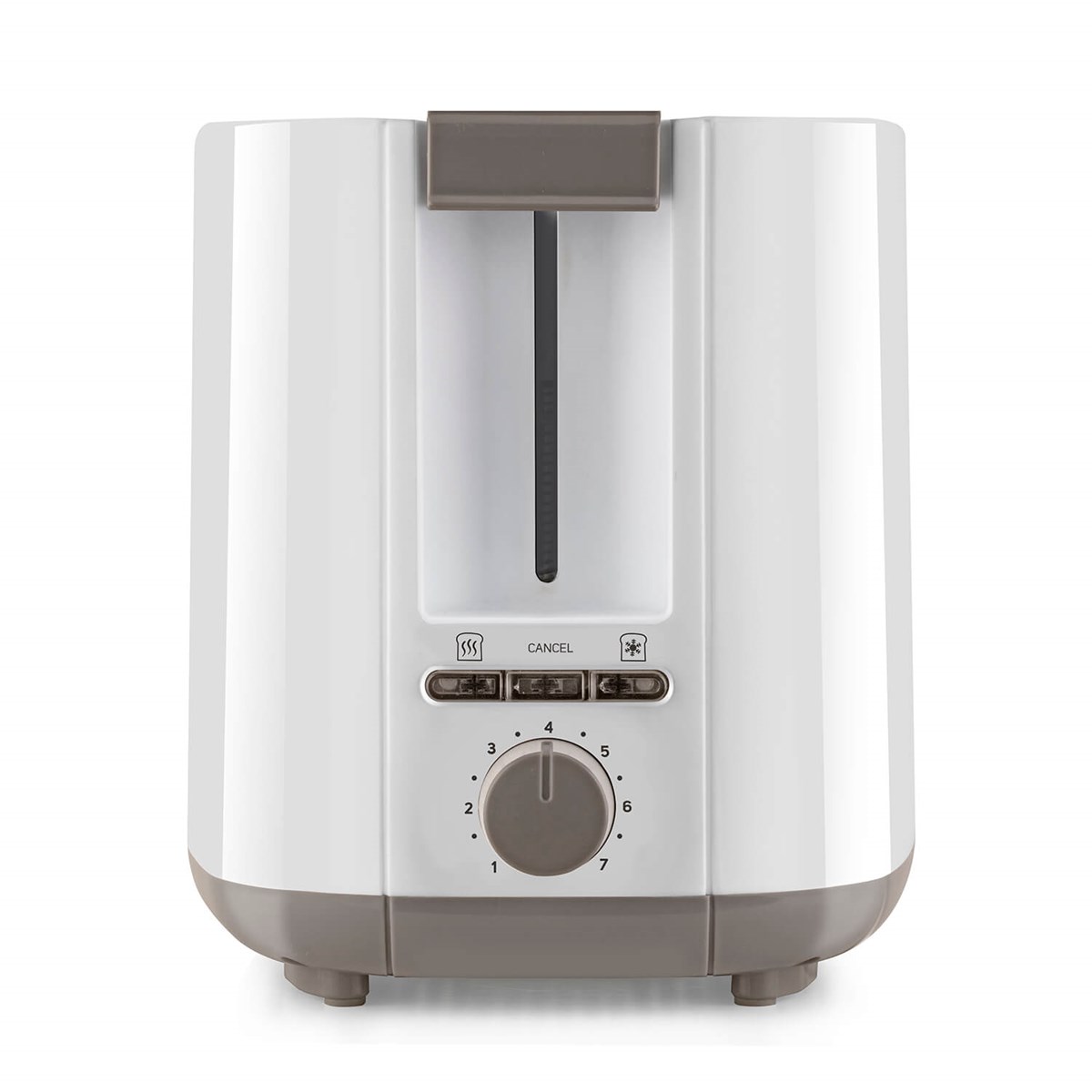 Med 750W effekt och sju olika rostningsnivåer kan du enkelt anpassa rostningen efter dina preferenser och olika brödsorter. Brödrosten erbjuder tre praktiska funktioner: avbryt för att stoppa rostningen och få upp brödet, värm för att värma redan rostat bröd, och tina för att rosta fryst bröd utan att bränna det.