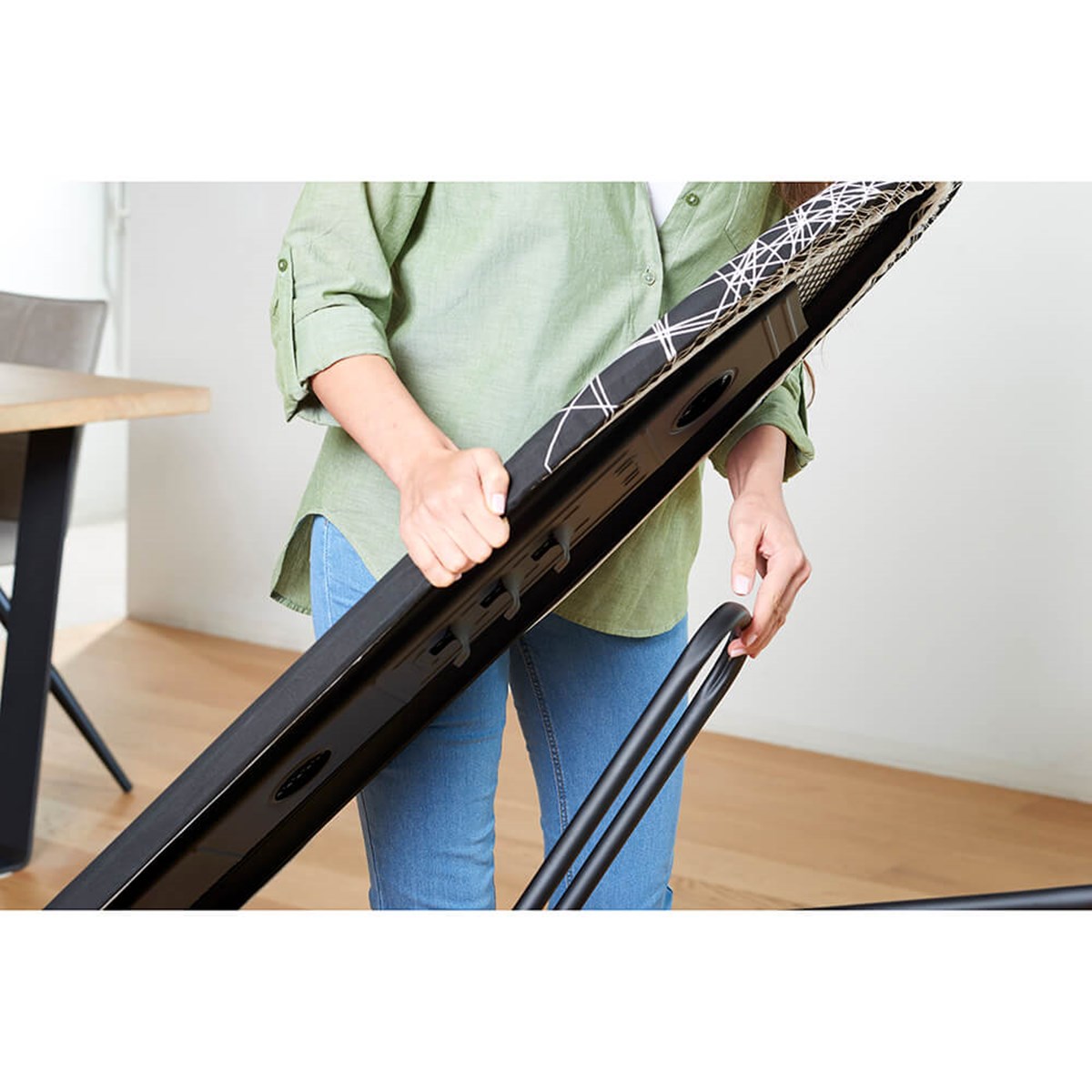 Argenta Black strykbräda, med 100 % bomullsgenomsläppligt överdrag och strykjärn. Du kan justera höjden tack vare dess 3 lägen, justerbar upp till 81 cm. Strykytan på brädan är 32x110 cm så du kan stryka vilken typ av plagg som helst utan problem. Det ger mer än tillräckligt med utrymme för att stryka bekvämt och enkelt.