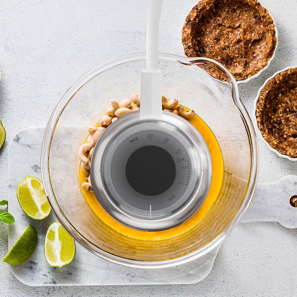 Denna stavmixer är utrustad med en kraftfull 750 W-motor, vilket gör den idealisk för en mängd olika mixningsuppgifter. Med 20 justerbara hastighetsinställningar kan du enkelt styra mixningsintensiteten så att den passar dina behov. Turbofunktionen ger en extra kraftfull boost för tuffare ingredienser.