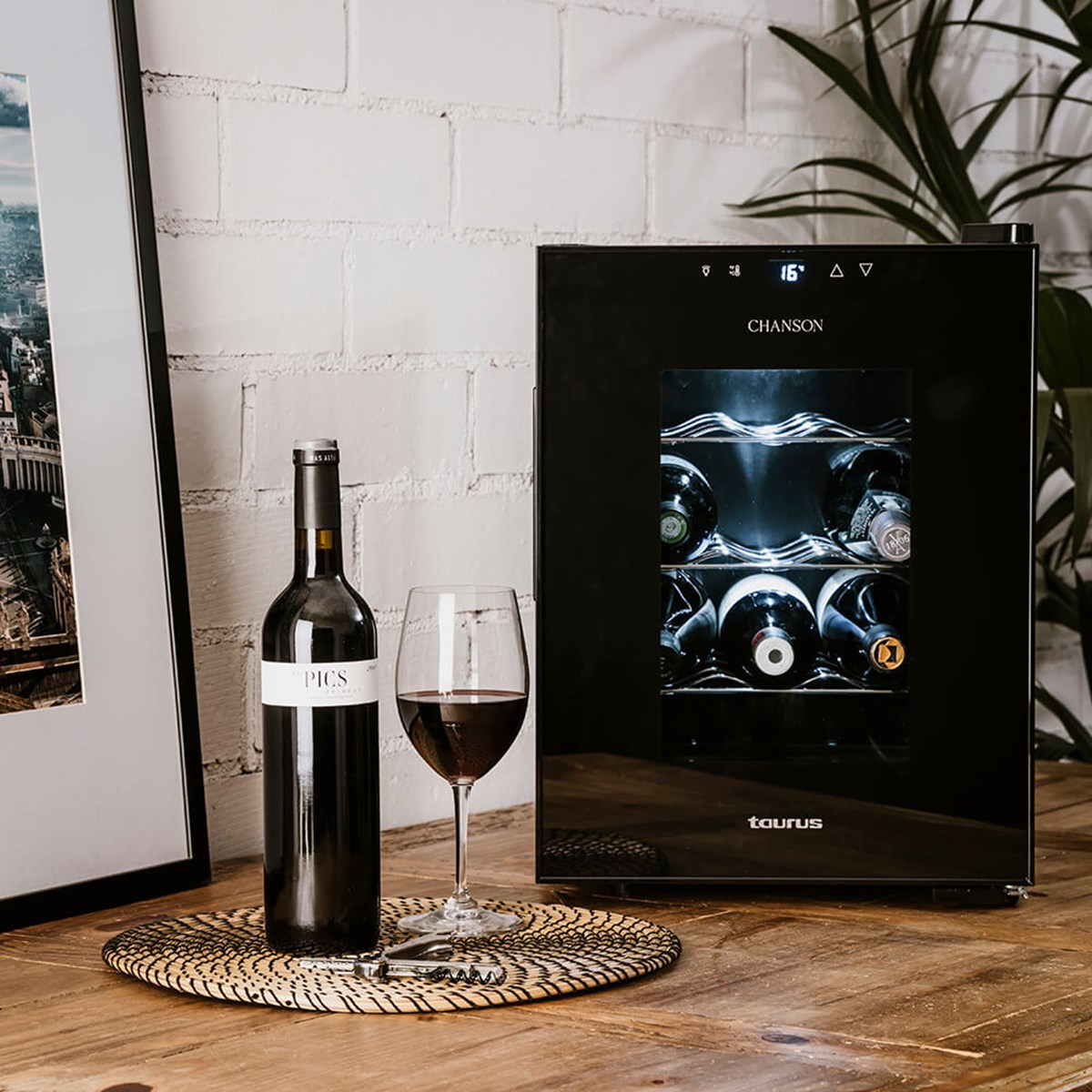 Med antivibrationssystem och dubbel glasdörr helt i svart som förhindrar att vinet blir trött och solens strålar eller utomhustemperaturen kommer in.