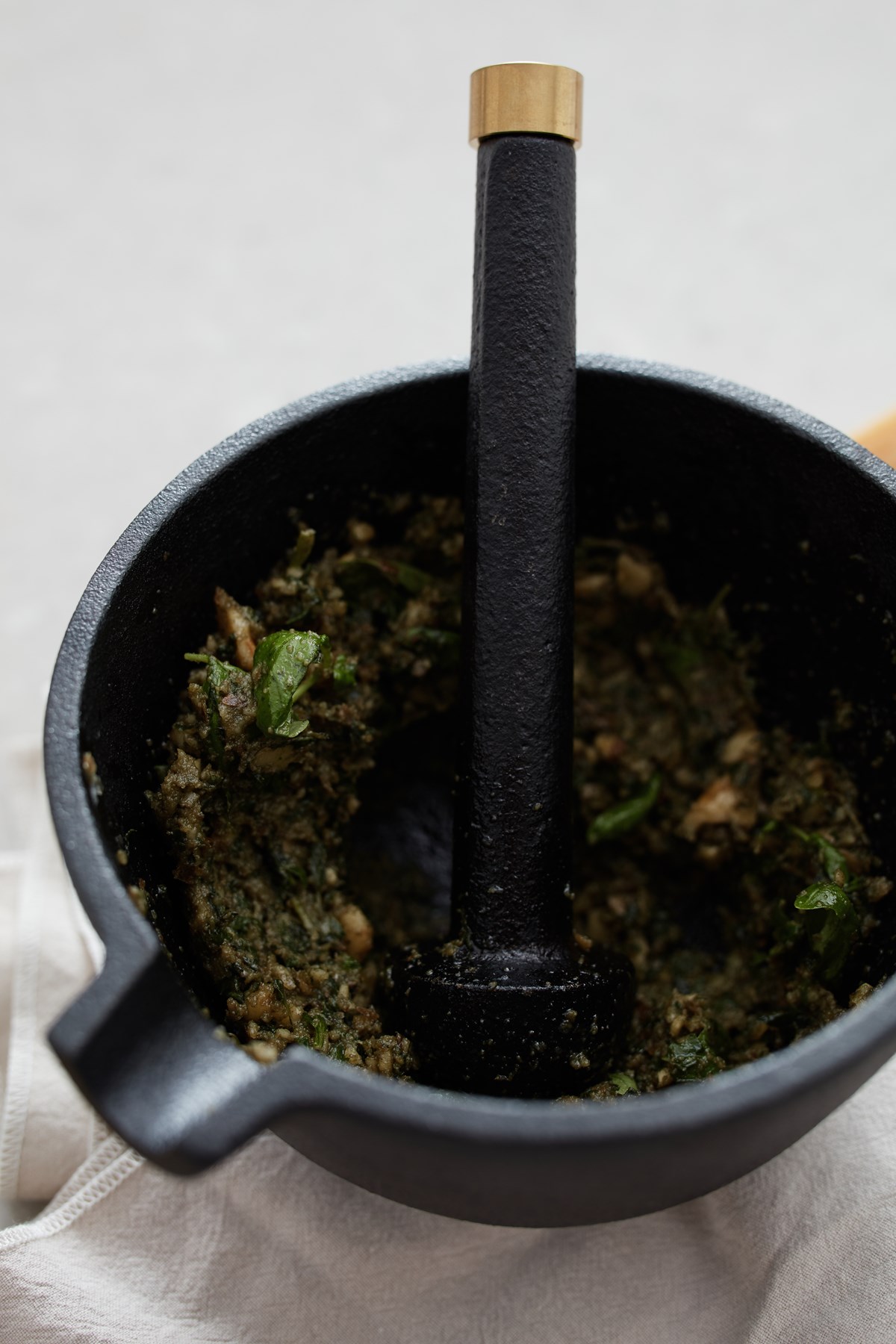 En stor och gedigen mortel perfekt till guaccamole eller andra kryddblandningar. Du kan dessutom göra hemmagjord pesto som tack vare den praktiska hällpipen smidigt hälls över för servering. Morteln är tillverkad i 100 % rågjutjärn. Mått: 15,5 x 10 cm. Presentkartong.