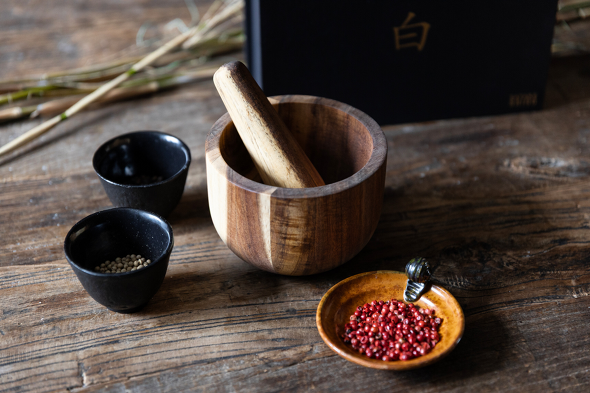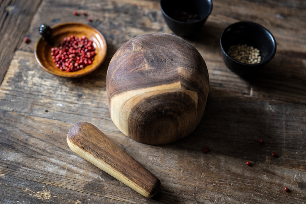 Denna vackra mortel med tillhörande stöt är tillverkad i ådrat akaciaträ – ett levande material som förhöjer både känslan och resultatet i köket. Perfekt för att stöta kryddor, örter och frön när du vill frigöra doft och smak på riktigt. Träets varma ton och mjuka linjer gör morteln lika vacker att låta stå framme som att använda. Den skålade formen ger god stabilitet och stöten ligger skönt i handen. Höjd: 9 cm, diameter: 12,5 cm.