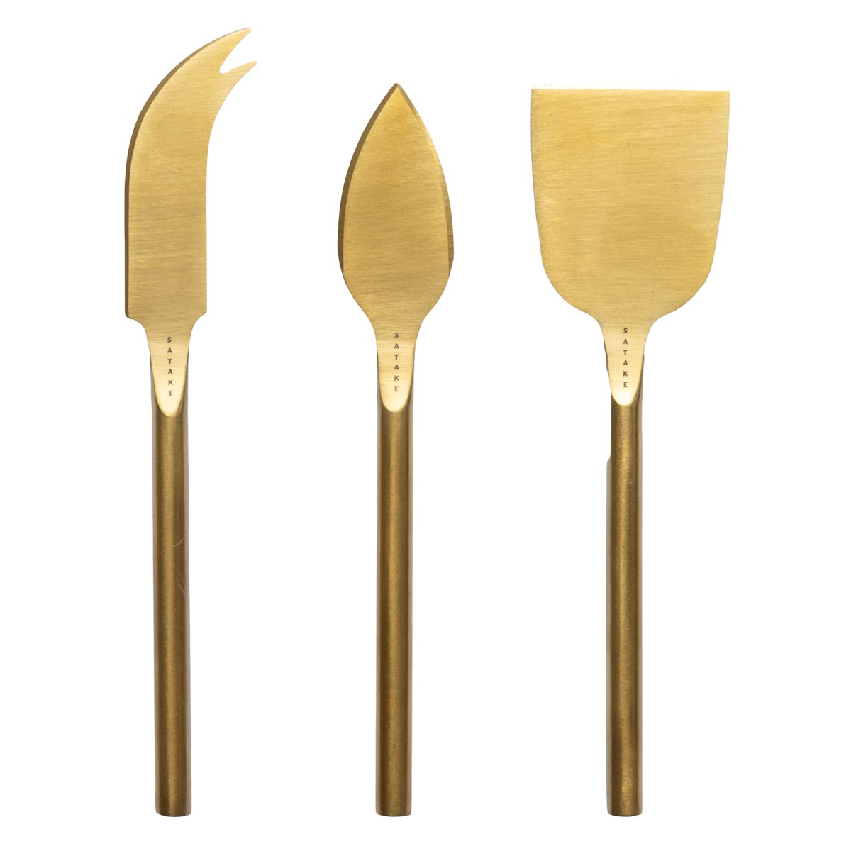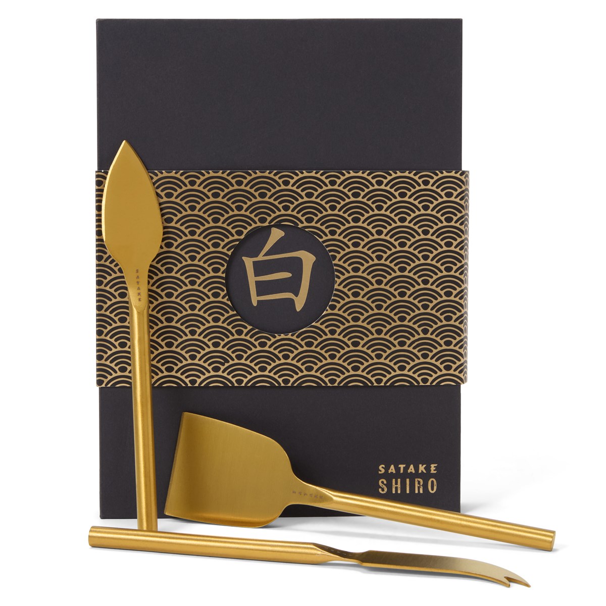 Satake Shiro ostset guld innehåller tre riktigt elgenata och stilrena ostknivar/redskap. En 18 cm klassisk ostkniv, en 18 cm spatel för hårda ostar och en 19 cm böjd ostkniv för semihårda ostar med gaffel i toppen som är perfekt för uppläggning. Redskapen är tillverkade i mässing och har en mycket exklusiv och stram design som kombinerar det japanska med det nordiska.
