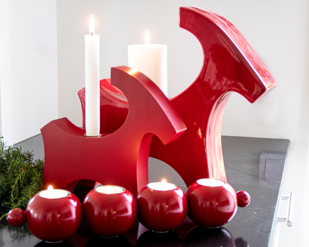Svensktillverkade träbockar med metallinsats anpassad till kronljus. Höjd 23 cm, längd 25 cm.