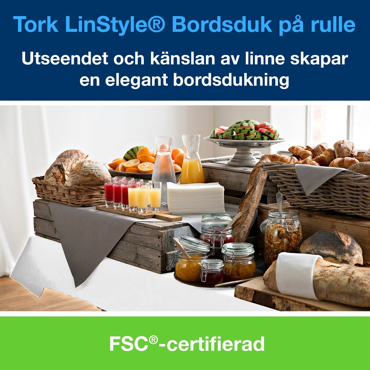 Tork LinStyle® Bordsduk på rulle är tillverkad av hög kvalitet och passar på restauranger med fullbetjäning, där det är extra viktigt att göra ett gott intryck på gästerna. Bordsduken både ser ut och känns som en äkta tygduk och är betydligt mjukare och tjockare än andra pappersprodukter. Ge dina kunder en elegant upplevelse med vår bordsduk med linnekänsla som finns i en rad klassiska färger.