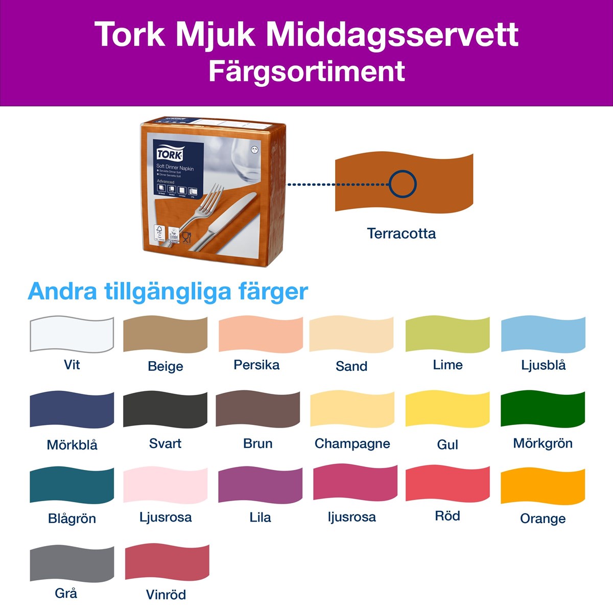 Ge avslappnade middagsmiljöer ett lyft med vår Tork Mjuk Middagsservett. Servettens höga kvalitet och 3-lagerstjocklek ger en lyxig känsla och ökad kundnöjdhet. Dessutom är den framtagen i större storlek för att förbättra gästernas bekvämlighet under hela måltiden. Med sin lättvikta utformning gör dessa restaurangservetter att personalen spenderar mindre tid på att förbereda bord inför servering. Det breda urvalet färger hjälper dig också att hitta en nyans som matchar din restaurangs existerande inredning.