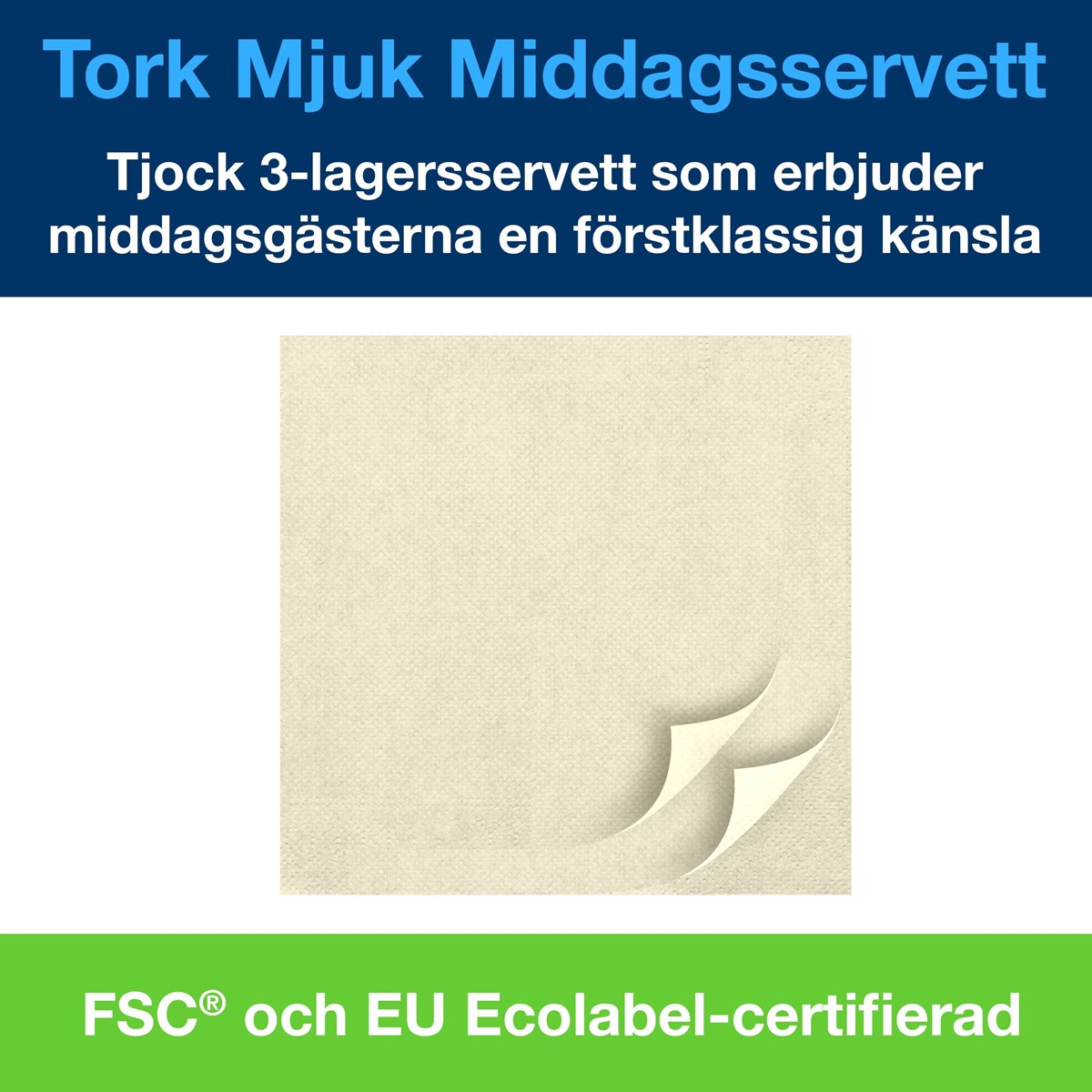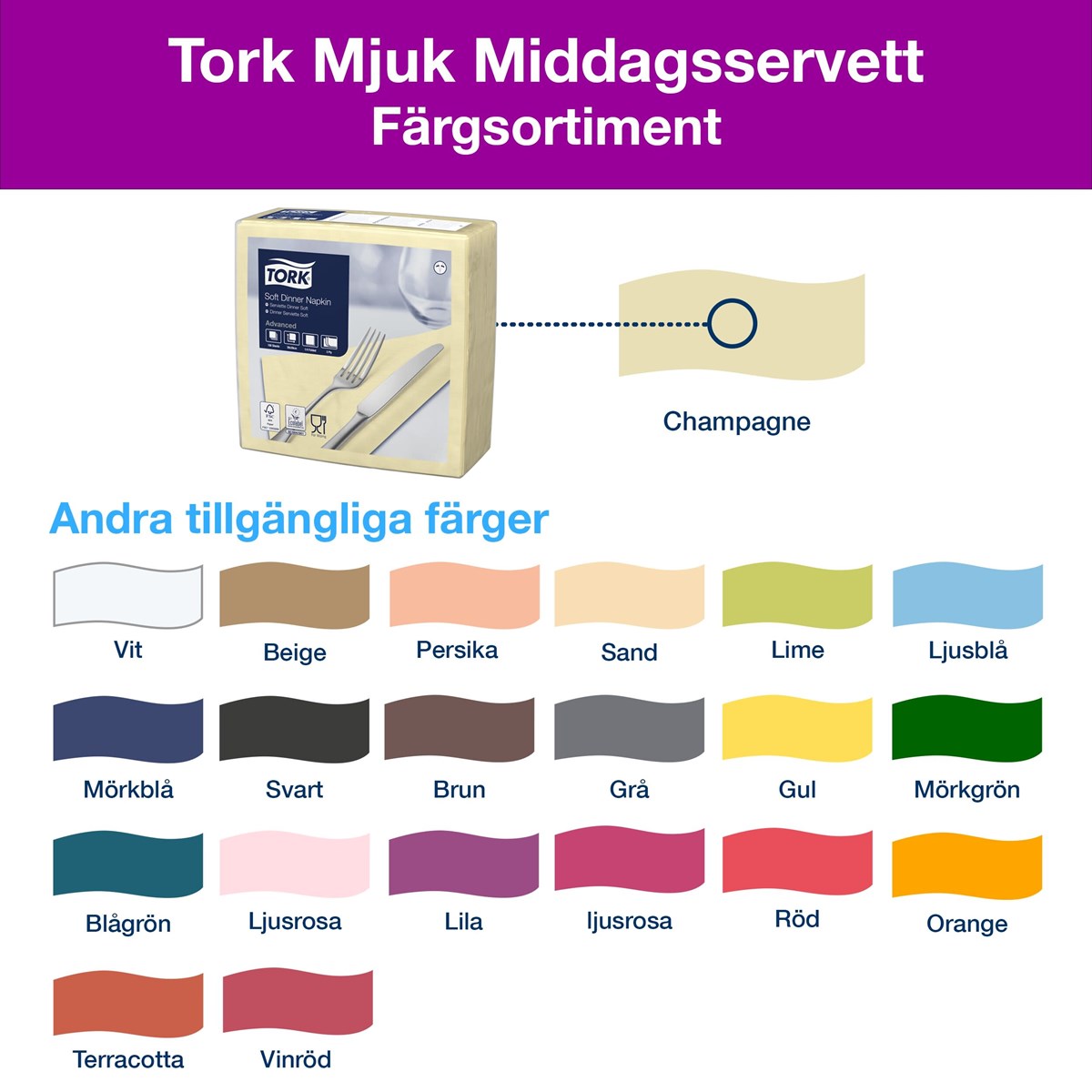 Ge avslappnade middagsmiljöer ett lyft med vår Tork Mjuk Middagsservett. Servettens höga kvalitet och 3-lagerstjocklek ger en lyxig känsla och ökad kundnöjdhet. Dessutom är den framtagen i större storlek för att förbättra gästernas bekvämlighet under hela måltiden. Med sin lättvikta utformning gör dessa restaurangservetter att personalen spenderar mindre tid på att förbereda bord inför servering. Det breda urvalet färger hjälper dig också att hitta en nyans som matchar din restaurangs existerande inredning.