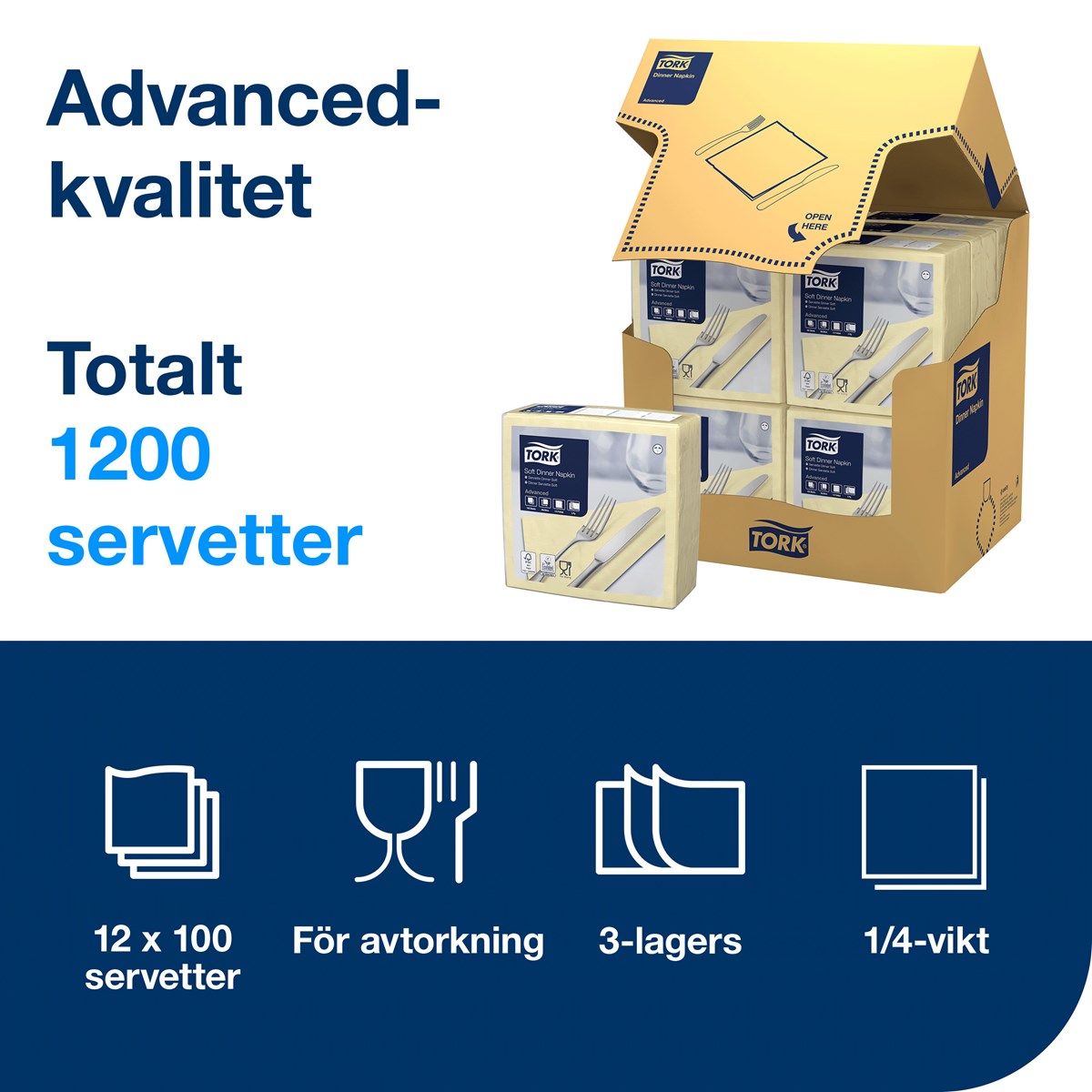 3-lagers servetter i Advanced kvalitet. Mått vikt: 19,75x19,5 cm. Mått ovikt: 39,5x39 cm. 100 servetter/förp., 12 förp./kartong.