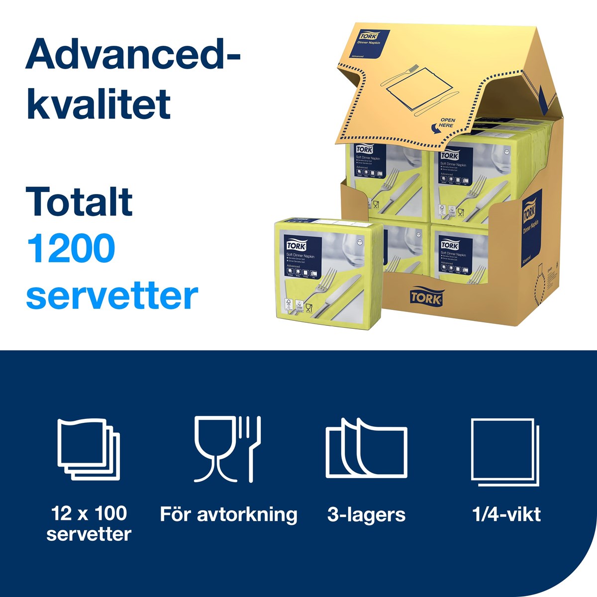 3-lagers servetter i Advanced kvalitet. Mått vikt: 19,75x19,5 cm. Mått ovikt: 39,5x39 cm. 100 servetter/förp., 12 förp./kartong.
