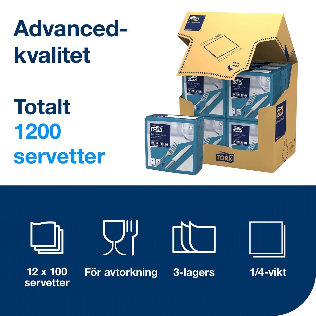 3-lagers servetter i Advanced kvalitet. Mått vikt: 19,75x19,5 cm. Mått ovikt: 39,5x39 cm. 100 servetter/förp., 12 förp./kartong.