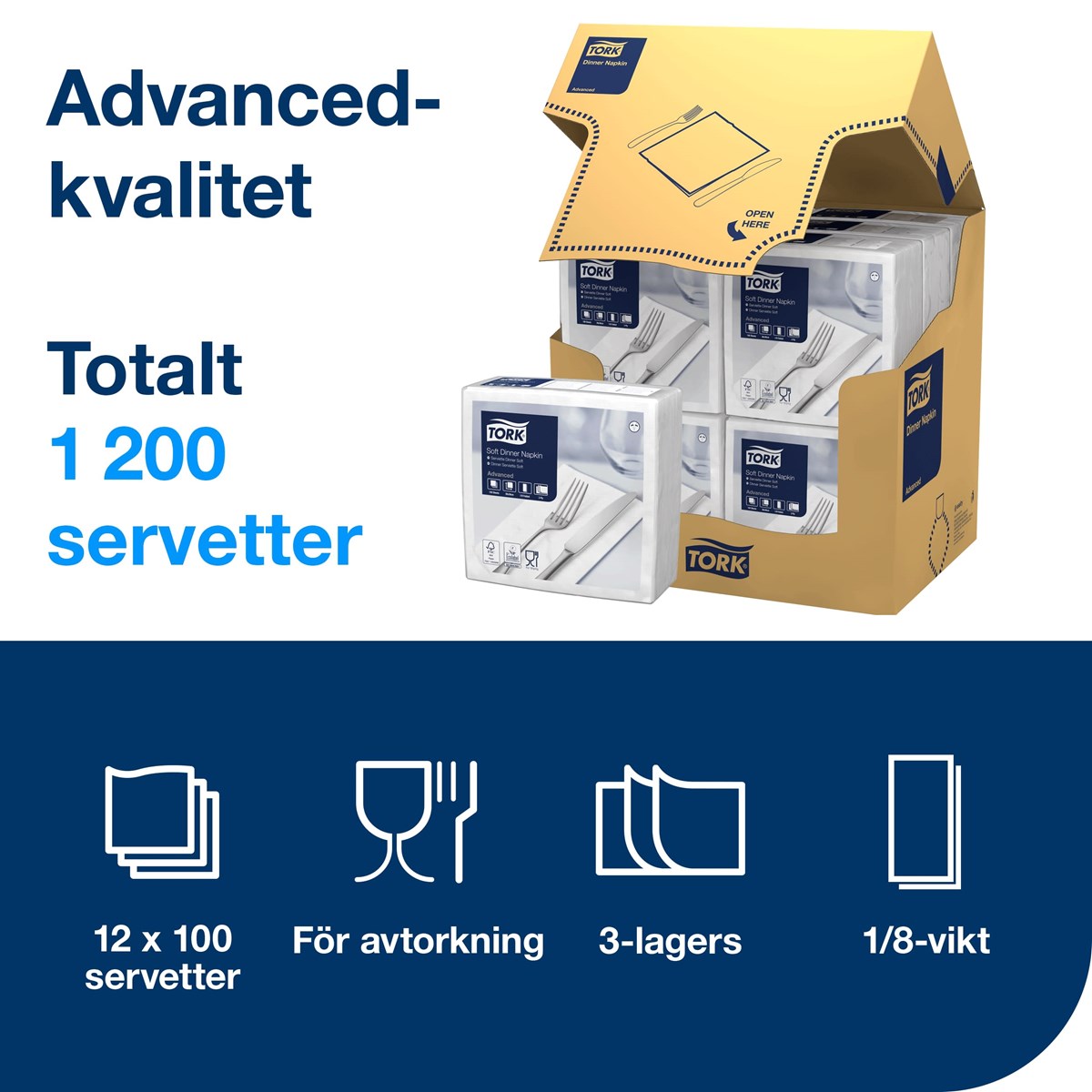 3-lagers. Advanced-kvalitet. Mått vikt: 19,75x9,75 cm. Mått ovikt 39,5x39 cm. 12 förpackningar, med 100 servetter vardera.