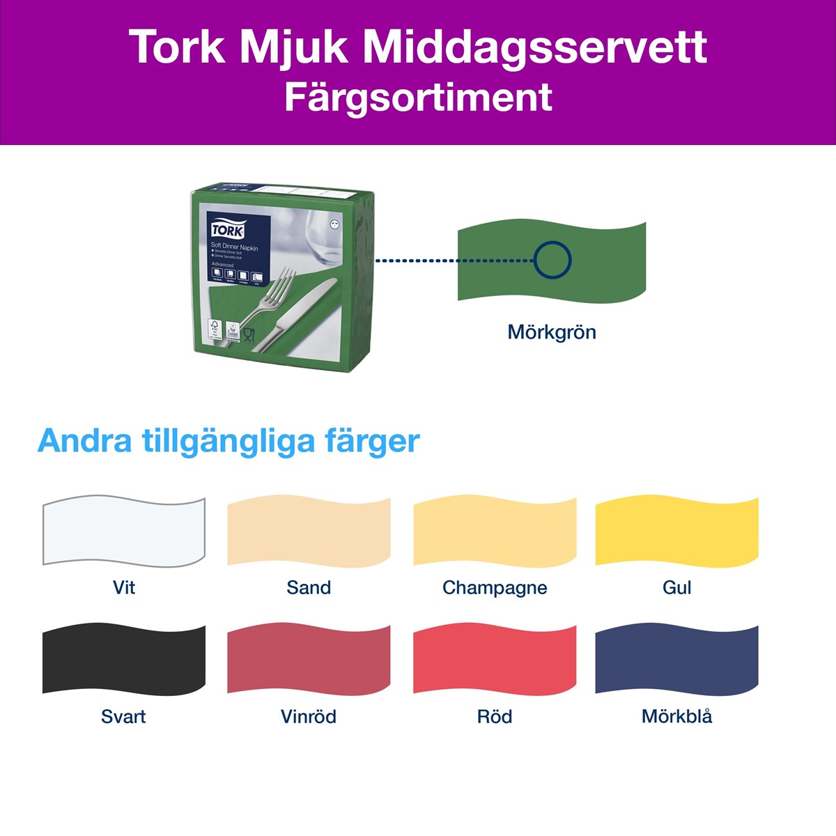 Imponera på dina gäster med vår högkvalitativa Tork Mjuk Middagsservett. Restaurangservetterna har en generös storlek för att förbättra bekvämligheten i avslappnade restauranger. Dessutom är 3-lagersservetterna utformade för att vara hela måltiden, vilket minskar förbrukningen och kostnaderna. Deras tjocklek och storlek gör att personal enkelt kan vika servetterna, vilket underlättar bordsförberedelser. Tack vare vårt stora utbud av moderna och klassiska nyanser är det enkelt att hitta en färg som matchar din inredning.