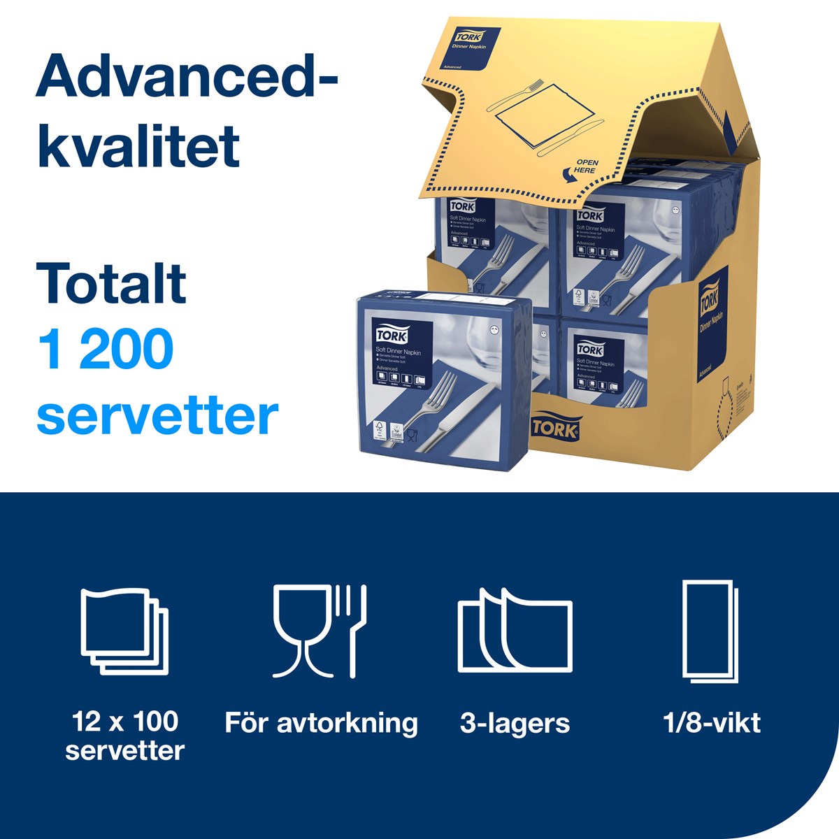3-lagers. Advanced-kvalitet. Mått vikt: 19,75x9,75 cm. Mått ovikt 39,5x39 cm. 12 förpackningar, med 100 servetter vardera.