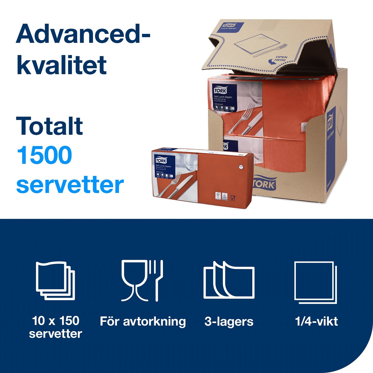 Med vårt breda urval av moderna och klassiska färger kan du enkelt matcha servetterna med din nuvarande restauranginredning. 3-lagers, Advanced-kvalitet. Vikt storlek: 16x4x16,25 cm. Ovikt storlek: 32,8x32,5 cm. 150 servetter/förp., 10 förp./kartong.