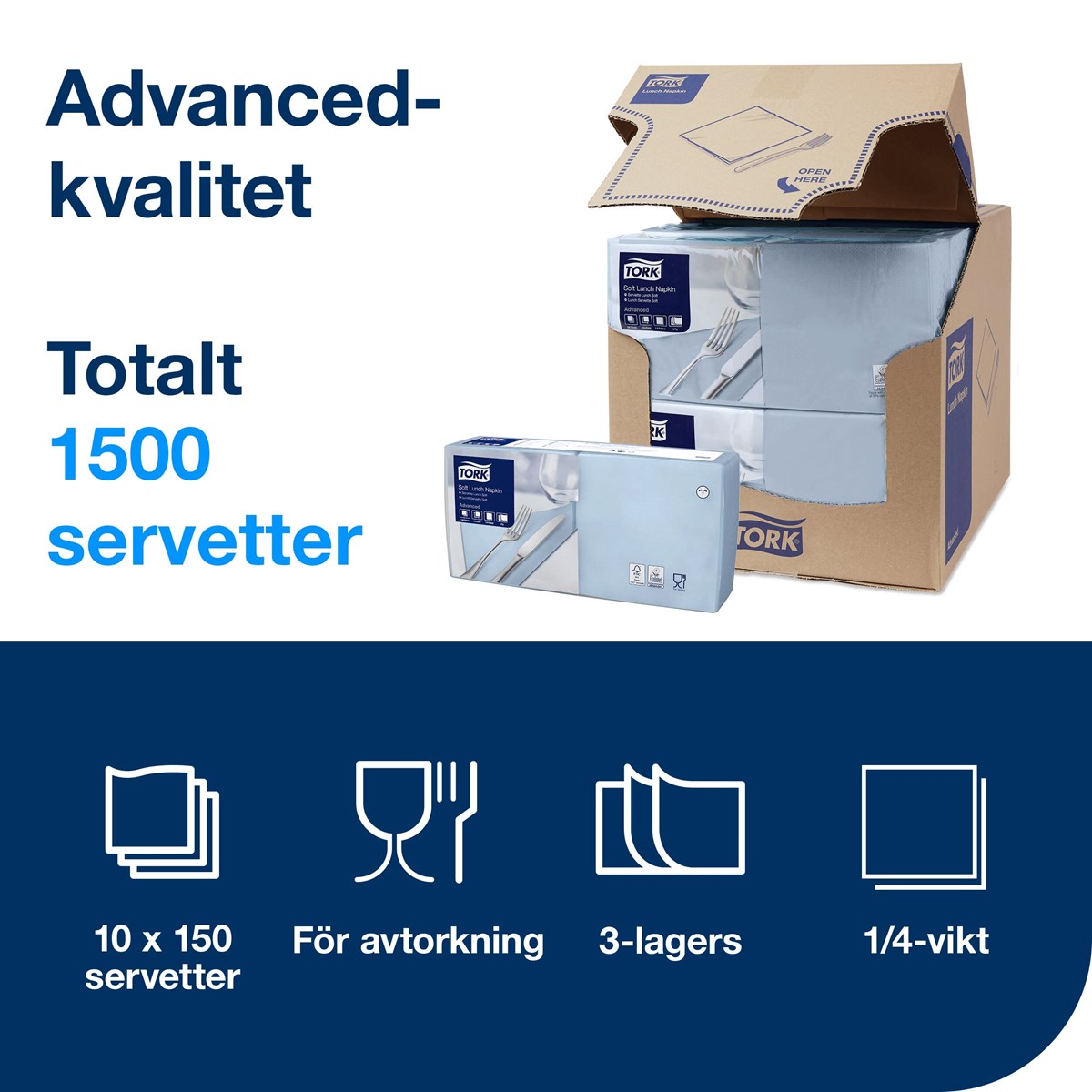 Med vårt breda urval av moderna och klassiska färger kan du enkelt matcha servetterna med din nuvarande restauranginredning. 3-lagers, Advanced-kvalitet. Vikt storlek: 16x4x16,25 cm. Ovikt storlek: 32,8x32,5 cm. 150 servetter/förp., 10 förp./kartong.