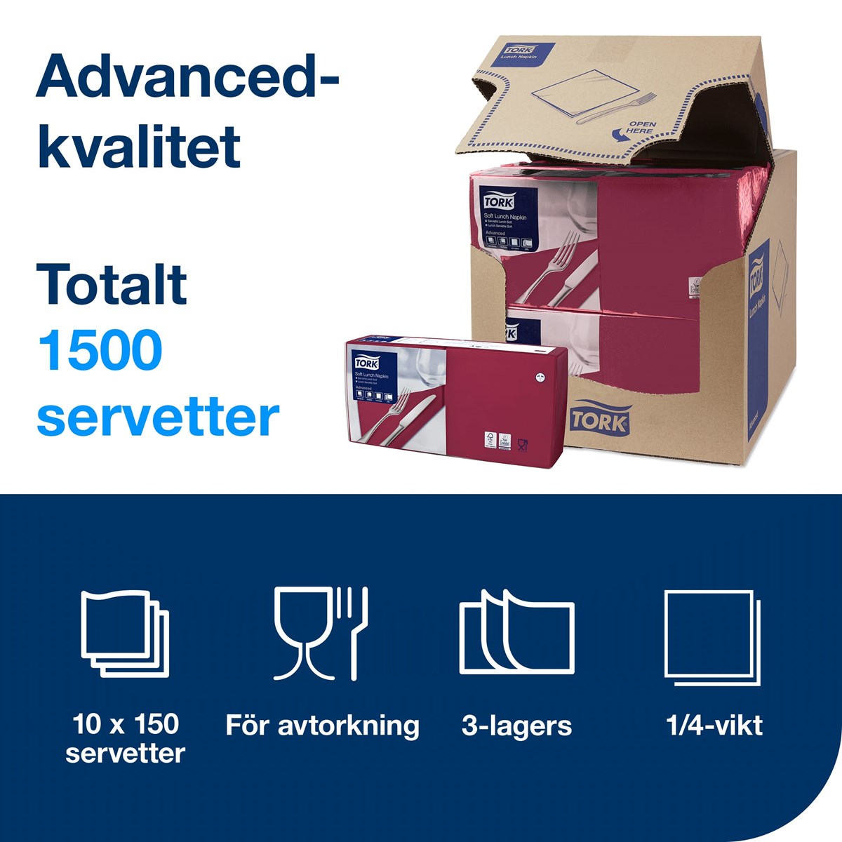 Med vårt breda urval av moderna och klassiska färger kan du enkelt matcha servetterna med din nuvarande restauranginredning. 3-lagers, Advanced-kvalitet. Vikt storlek: 16x4x16,25 cm. Ovikt storlek: 32,8x32,5 cm. 150 servetter/förp., 10 förp./kartong.