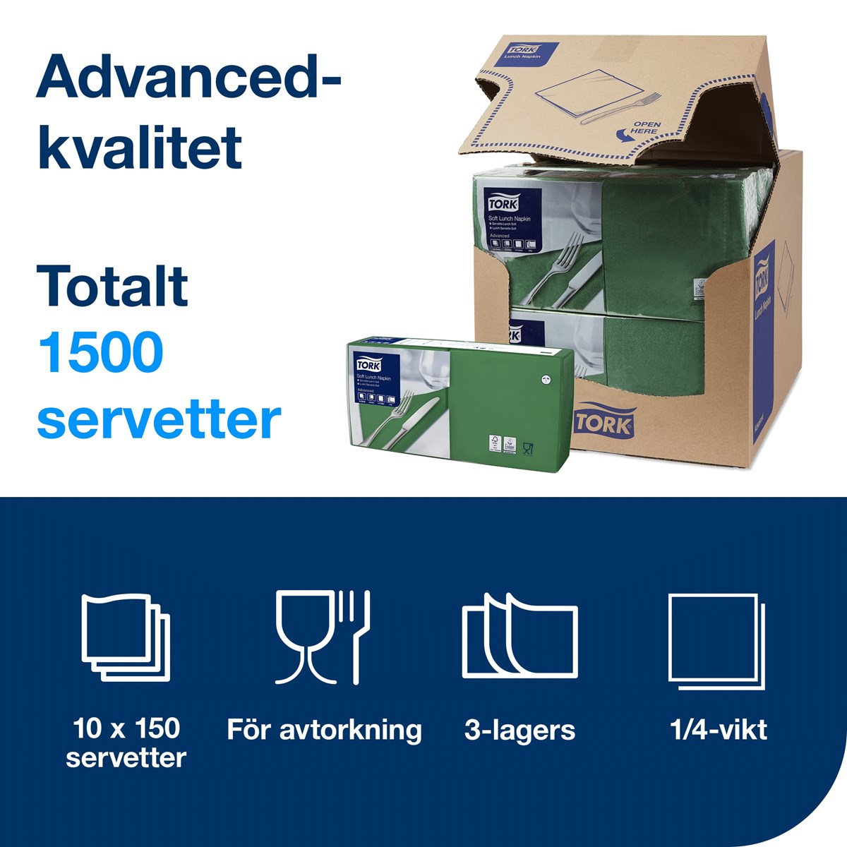 Med vårt breda urval av moderna och klassiska färger kan du enkelt matcha servetterna med din nuvarande restauranginredning. 3-lagers, Advanced-kvalitet. Vikt storlek: 16x4x16,25 cm. Ovikt storlek: 32,8x32,5 cm. 150 servetter/förp., 10 förp./kartong.