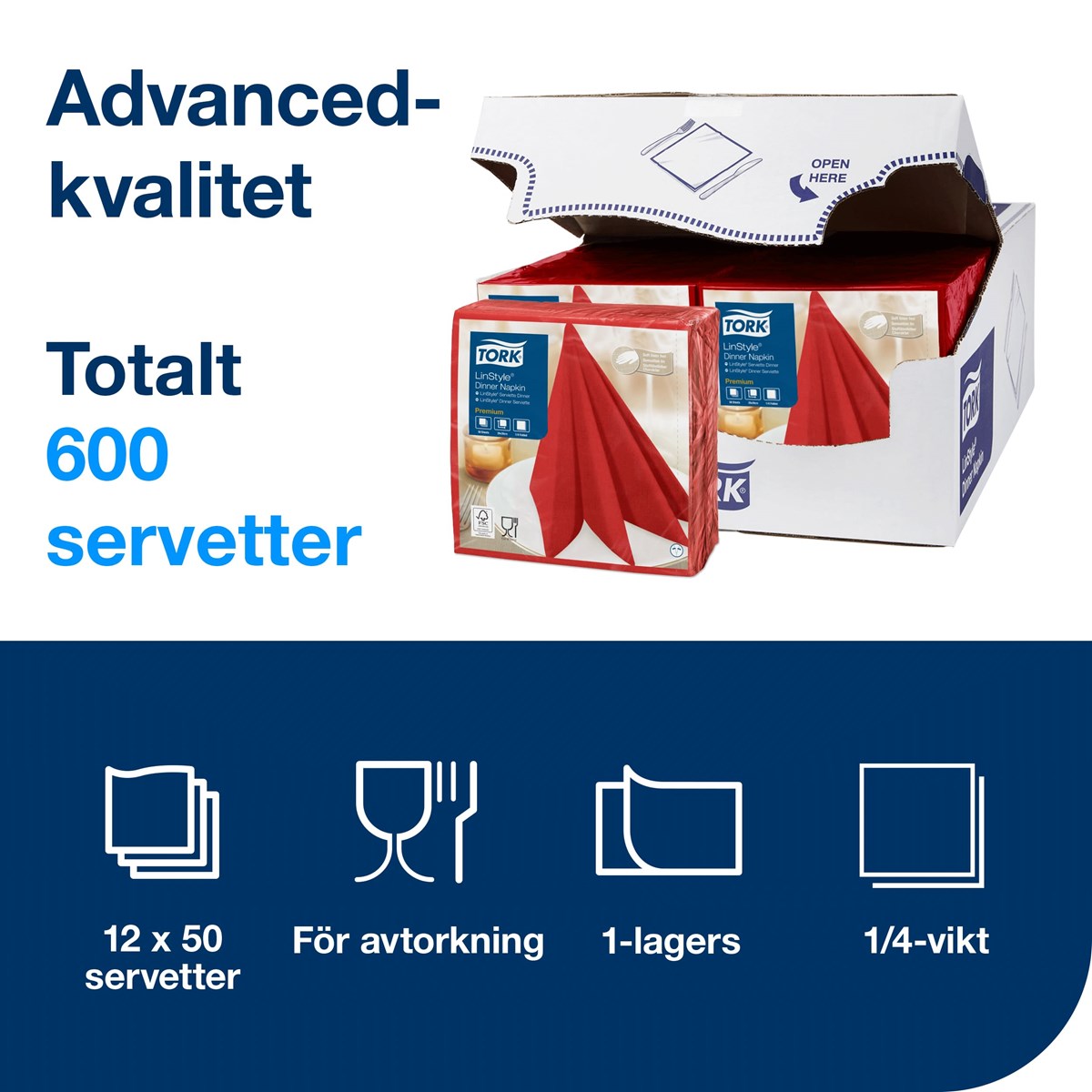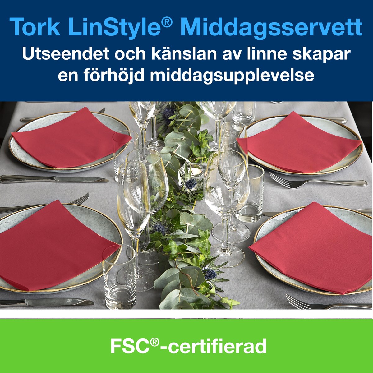 Gör ett fantastiskt första intryck i fullbetjäningsrestauranger med högkvalitativa LinStyle® Middagsservett. Med sin känsla av linne är den mjukare och tjockare än vanliga pappersservetter och ger ett elegant intryck. Suverän hållbarhet gör att restaurangservetterna varar under hela middagen, vilket minskar kostnader och förbrukning. Samtidigt ser den höga absorptionsförmågan till att personal enkelt kan städa upp spill. Med engångsservetter slipper personalen också tvättbesvären som kommer med textilservetter. 1-lagers. Premium-kvalitet. Mått vikt: 19,5x19,5 cm. Mått ovikt: 39x39 cm.