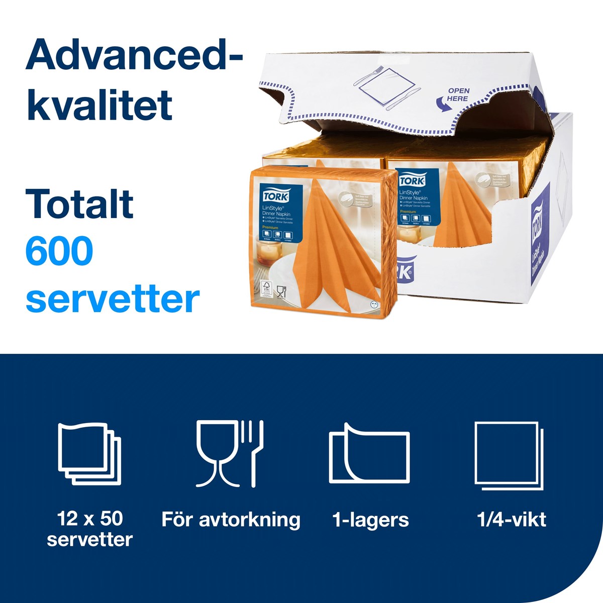 Gör ett fantastiskt första intryck i fullbetjäningsrestauranger med högkvalitativa LinStyle® Middagsservett. Med sin känsla av linne är den mjukare och tjockare än vanliga pappersservetter och ger ett elegant intryck. Suverän hållbarhet gör att restaurangservetterna varar under hela middagen, vilket minskar kostnader och förbrukning. Samtidigt ser den höga absorptionsförmågan till att personal enkelt kan städa upp spill. Med engångsservetter slipper personalen också tvättbesvären som kommer med textilservetter. 1-lagers. Premium-kvalitet. Mått vikt: 19,5x19,5 cm. Mått ovikt: 39x39 cm.