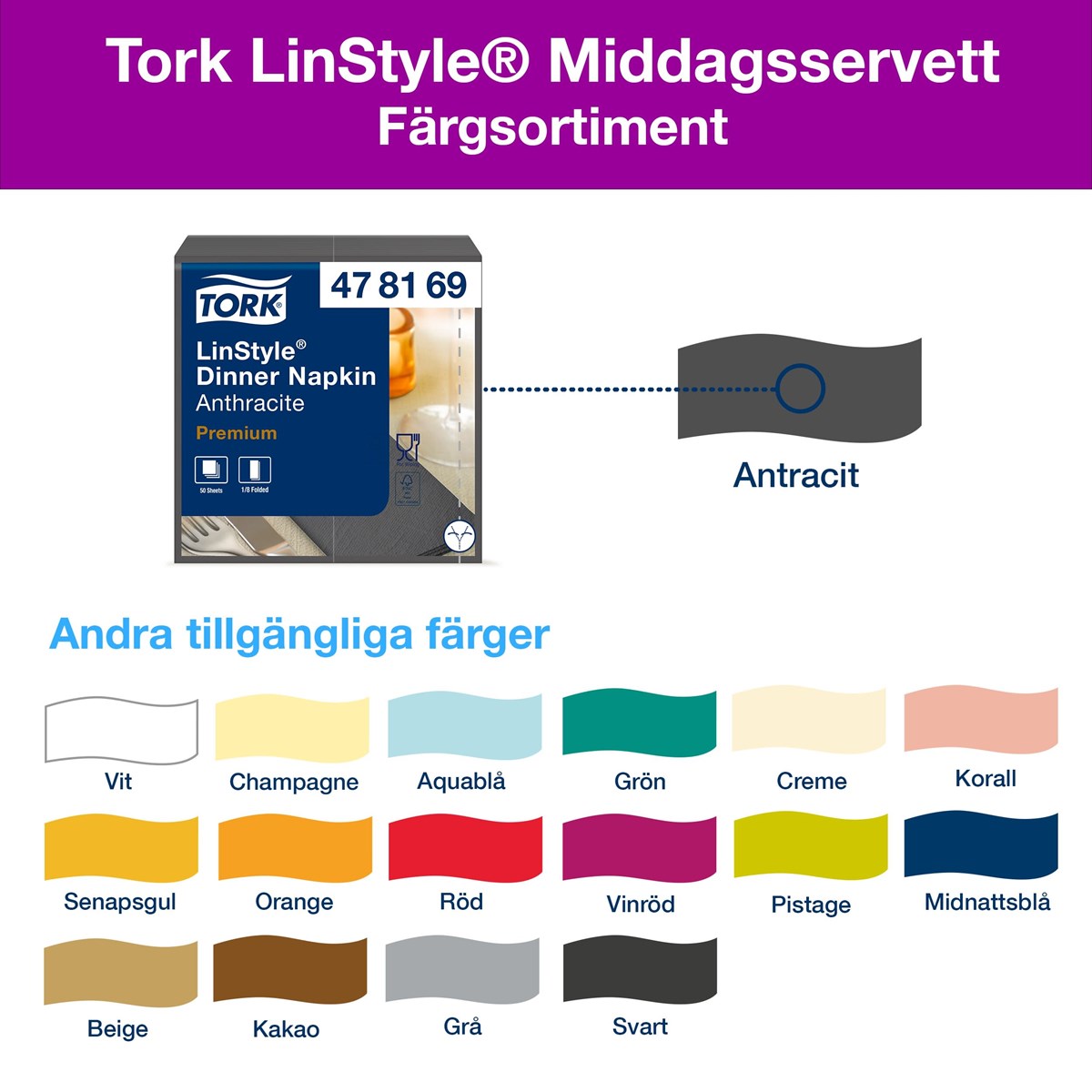 Första intrycket är viktigt på restauranger med fullbetjäning. Det högkvalitativa utseendet på Tork LinStyle® Middagsservett är till för att imponera på dina gäster. De är mjukare och tjockare än vanliga pappersprodukter och extra absorberande för att effektivt torka upp spill. Gäster kommer att uppskatta den eleganta linnekänslan hos dessa premiumservetter. Jämfört med äkta linne så sparar du dessutom tvättkostnader och besvär med engångskvaliteten.