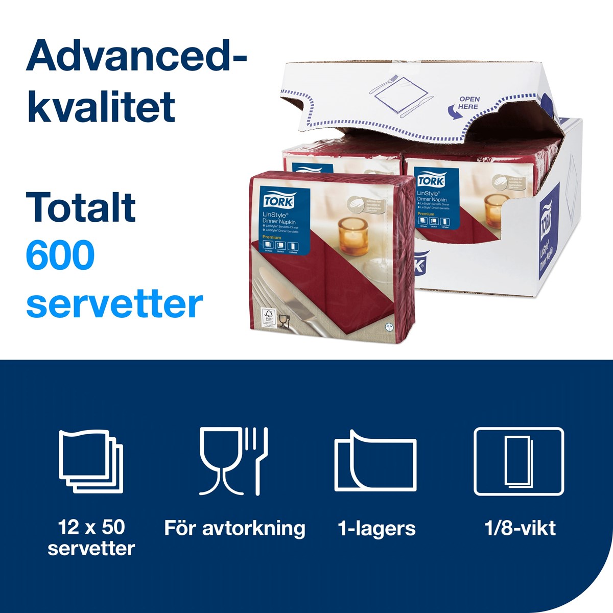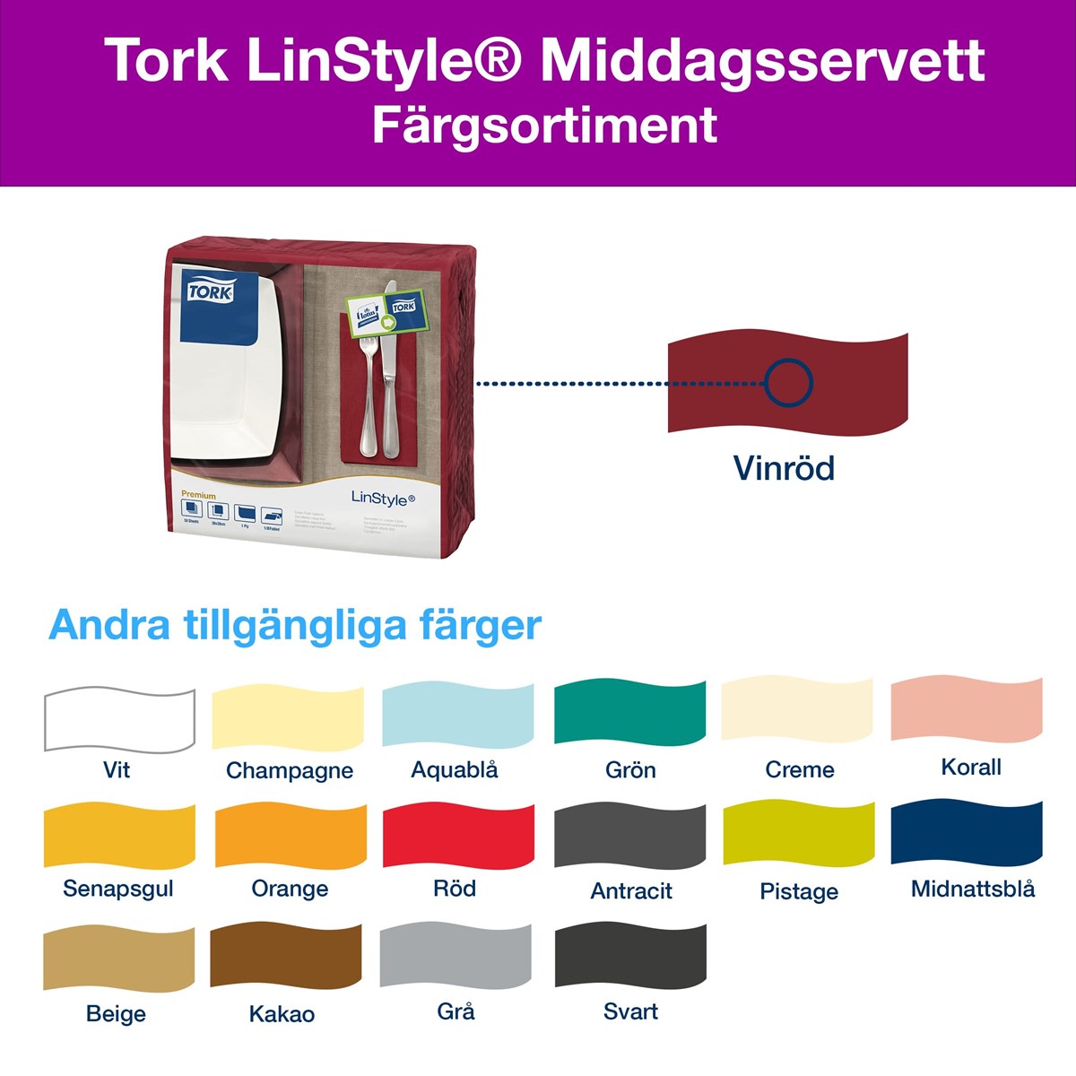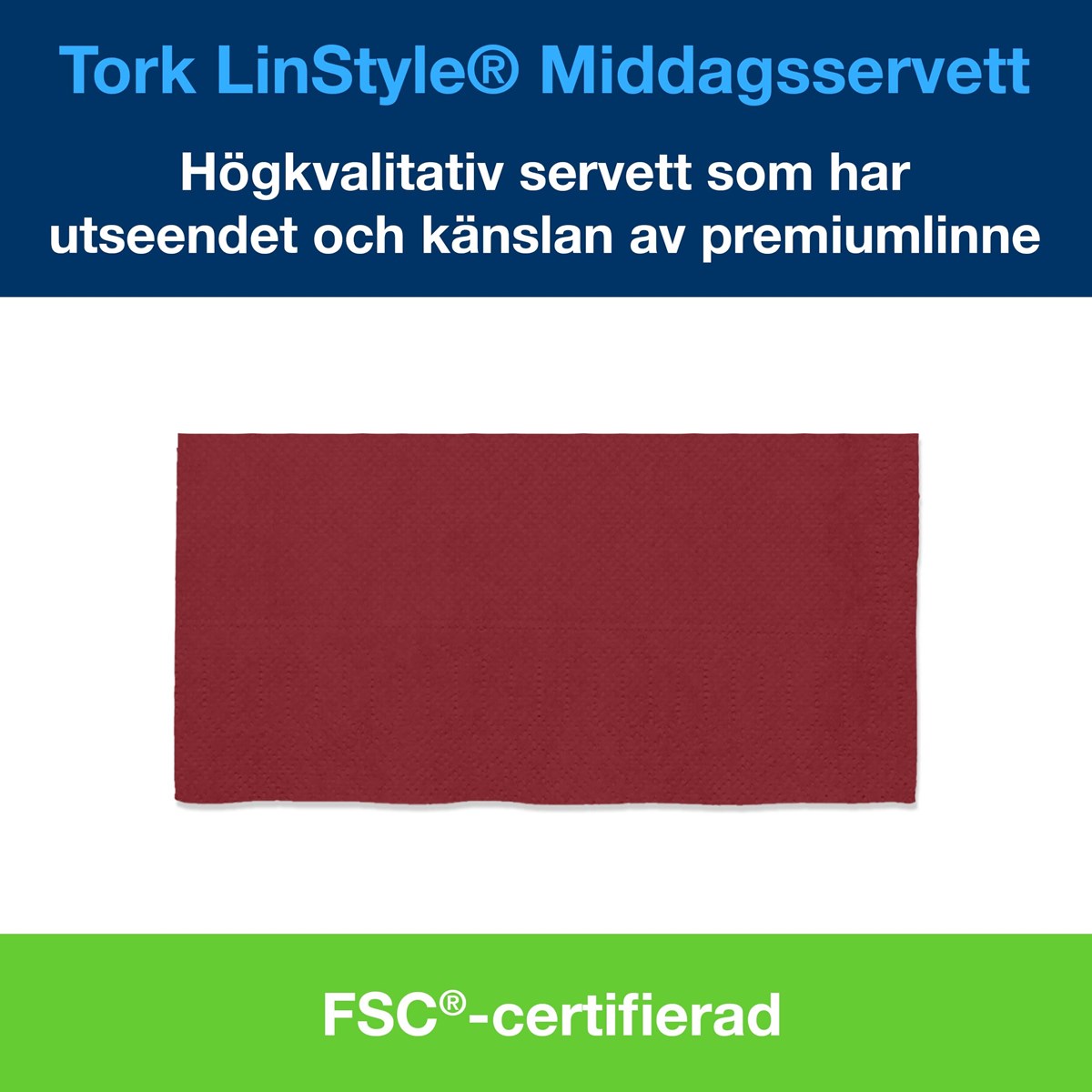 Första intrycket är viktigt på restauranger med fullbetjäning. Det högkvalitativa utseendet på Tork LinStyle® Middagsservett är till för att imponera på dina gäster. De är mjukare och tjockare än vanliga pappersprodukter och extra absorberande för att effektivt torka upp spill. Gäster kommer att uppskatta den eleganta linnekänslan hos dessa premiumservetter. Jämfört med äkta linne så sparar du dessutom tvättkostnader och besvär med engångskvaliteten.