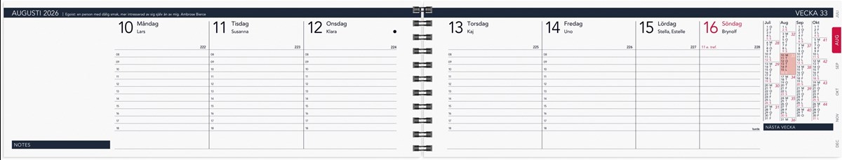 Format: 255x95 mm. Layout: Stående. Vecka/uppslag. Timindelning 8-18. Kalendarium: 2025-12-22 - 2027-01-03. Omslag: Papper. Spiralbunden. Innehåll: Kyrkliga helgdagar, Flaggdagar, Helgdagar/aftnar, Månfaser, Namnsdagar, Internationella helgdagar översikt, Temadagar/händelser, Årsöversikt/årsöversikter, Årsplan/årsplaner. Antal sidor: 120. Miljöinformation: FSC®.
