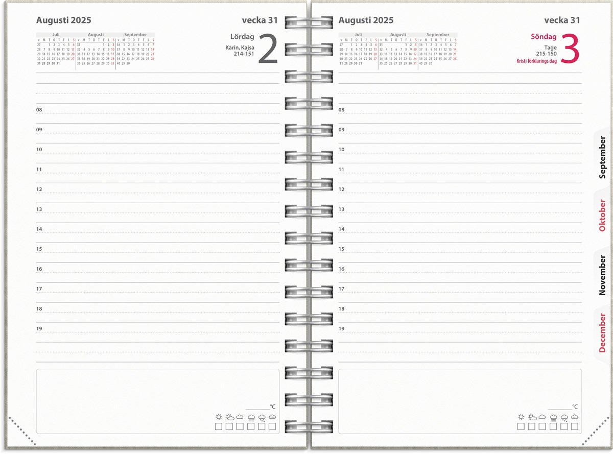 En dag per sida ger massor av plats för både planering och reflektion. Urstansat månadsregister. Mycket skrivyta varje dag.