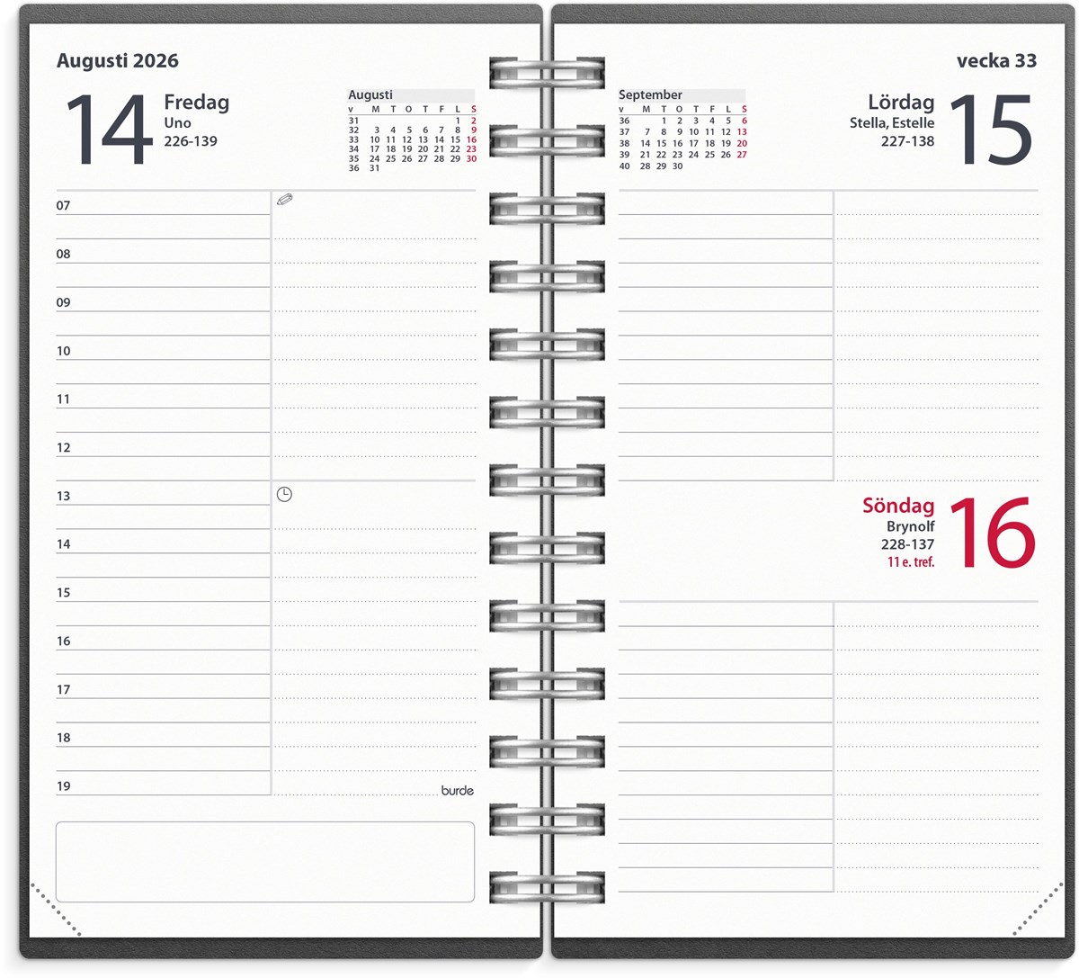 Format: 95x170 mm. Layout: Dag/sida. Timindelning 7-19. Kalendarium: 2025-12-22 - 2027-01-03. Omslag: Återvunnen kartong. Spiralbunden. Innehåll: Kyrkliga helgdagar, Flaggdagar, Helgdagar/aftnar, Månfaser, Namnsdagar, Internationella helgdagar översikt, Temadagar/händelser, Årsöversikt/årsöversikter, Årsplan/årsplaner. Antal sidor: 352. Miljöinformation: FSC®. Omslag i återvunnen kartong. Tillverkad i Småland.