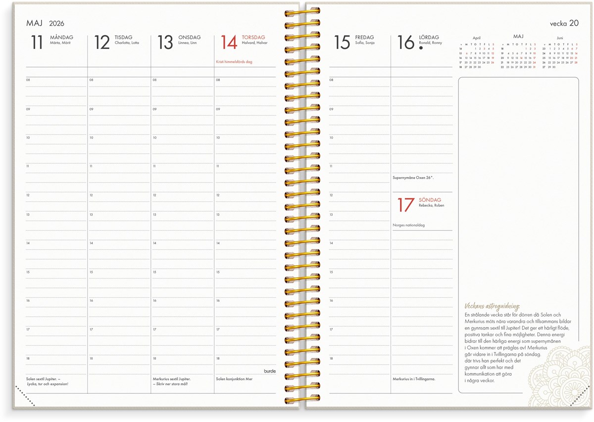 Format: A5. Layout: Stående. Vecka/uppslag. Timindelning 8-18. Kalendarium: 2025-12-22 - 2027-01-03. Omslag: Kartong med struktur. Spiralbunden. Innehåll: Faktatexter om astrologi, Flaggdagar, Helgdagar/aftnar, Månfaser, Namnsdagar, Anteckningsyta, Temadagar/händelser, Årsöversikt/årsöversikter. Antal sidor: 176. Miljöinformation: FSC®.