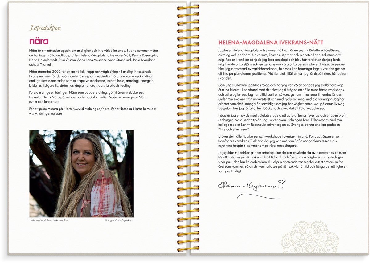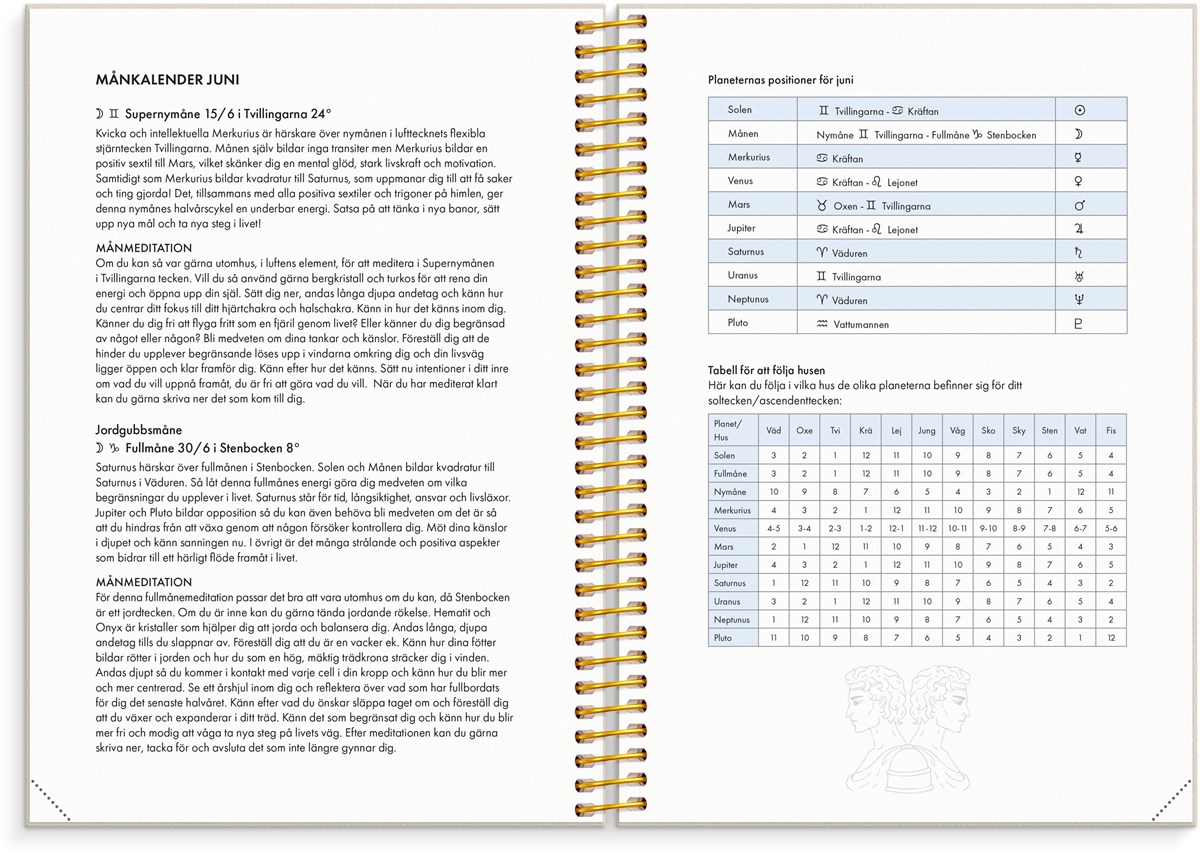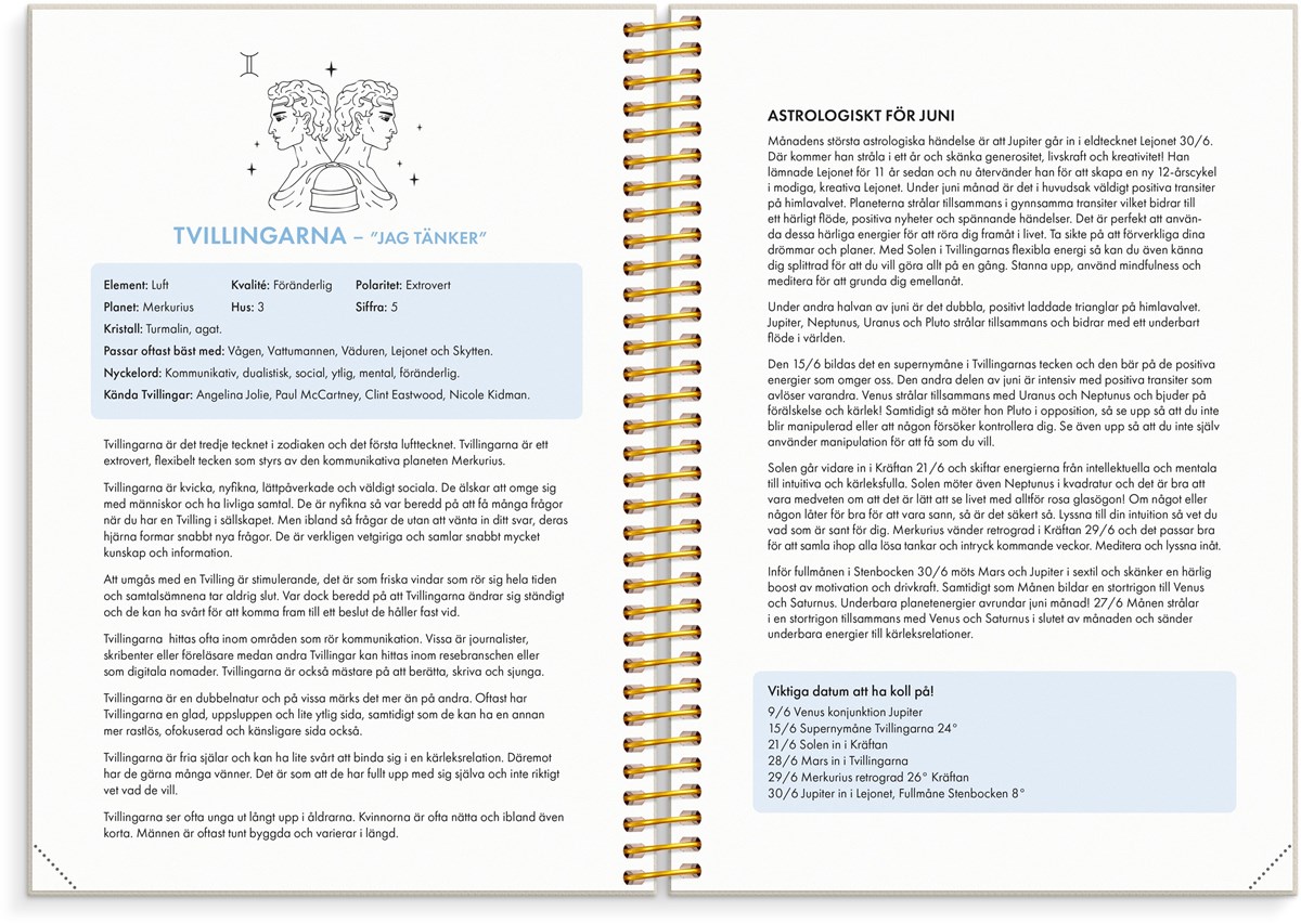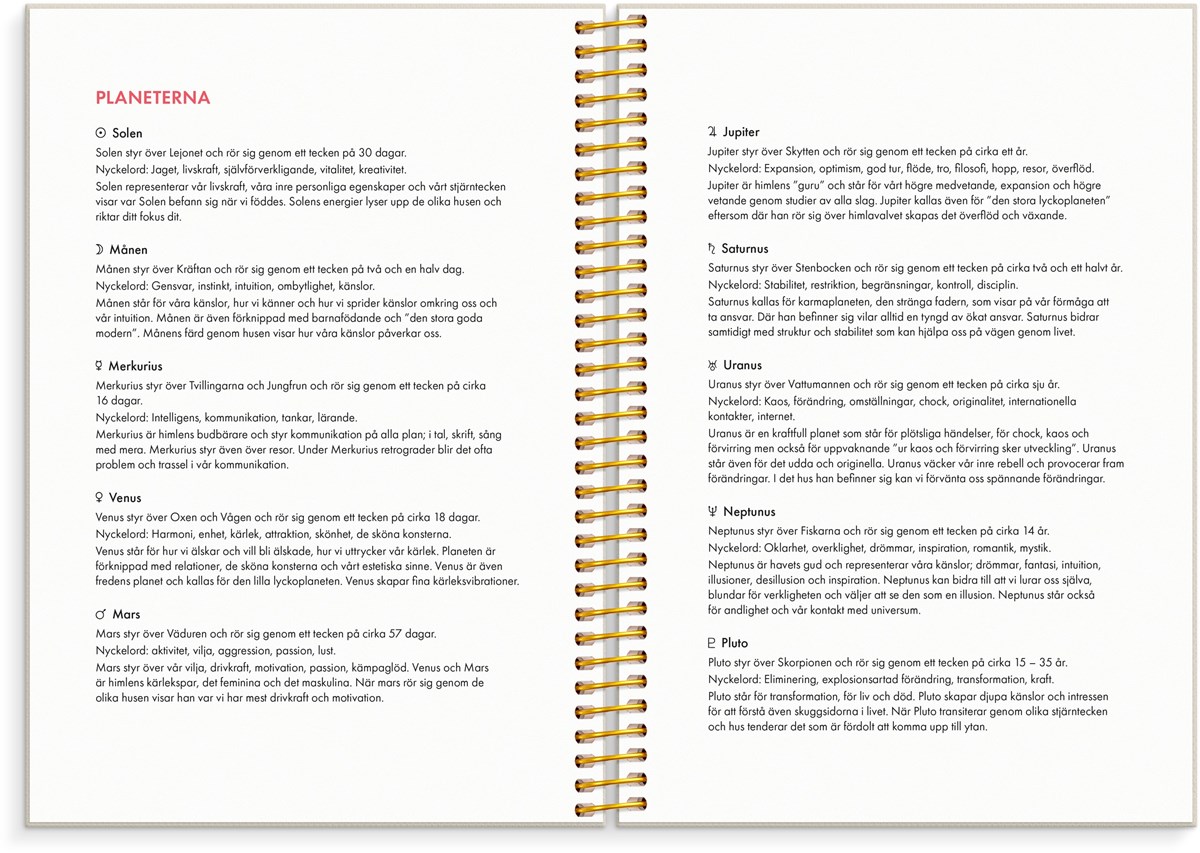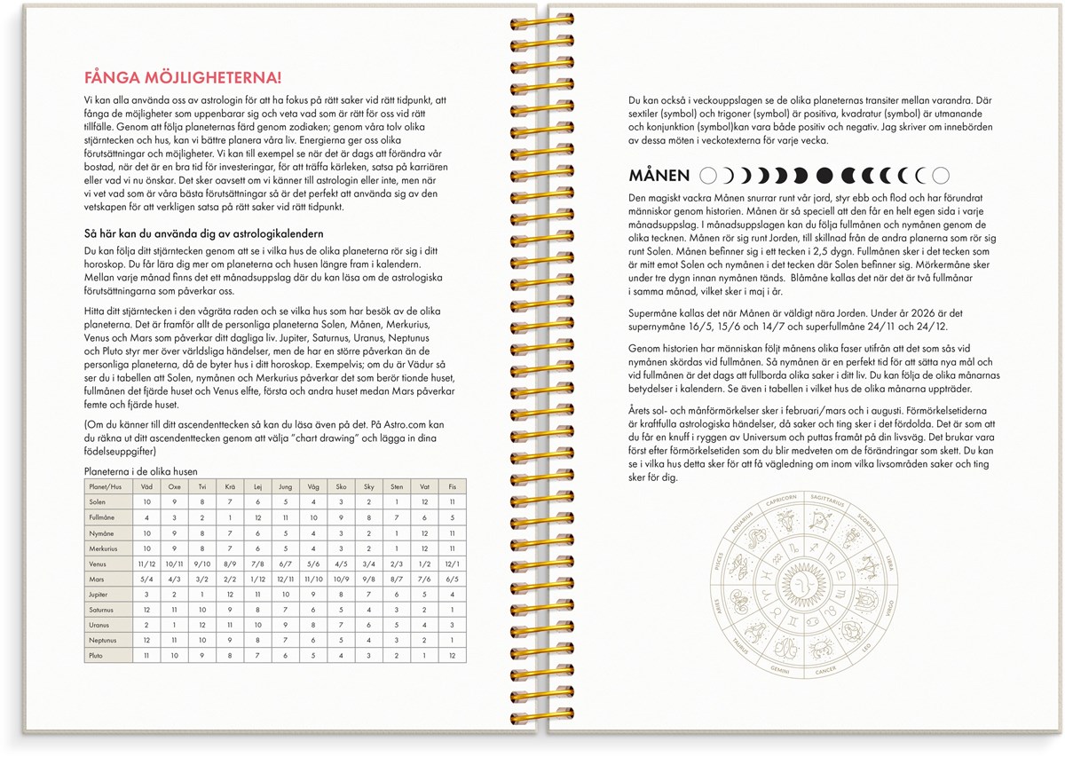 Du får råd om när du ska öka tempot och när du behöver ta det lugnt. Astrologi kan tillämpas på olika områden, både på det stora i livet och på aspekter som kärlek, hälsa, ekonomi, karriär och din personliga utveckling. I den här A5 veckokalendern kommer du att lära dig hur du kan följa ditt eget stjärnteckens inflytande varje vecka och månad under året. I kalendern kommer du att lära dig om astrologi och om dig själv! Den är utformad för att du ska kunna använda den för att skapa det bästa möjliga 2026! Så att du kan göra rätt saker vid rätt tidpunkt och förstå det energiflöde som omger dig. Varje månad kommer du att kunna läsa om hur nymånens och fullmånens påverkan kan påverka dig. Det kommer att hjälpa dig att ta nya steg vid nymånen och avsluta projekt vid fullmånen.