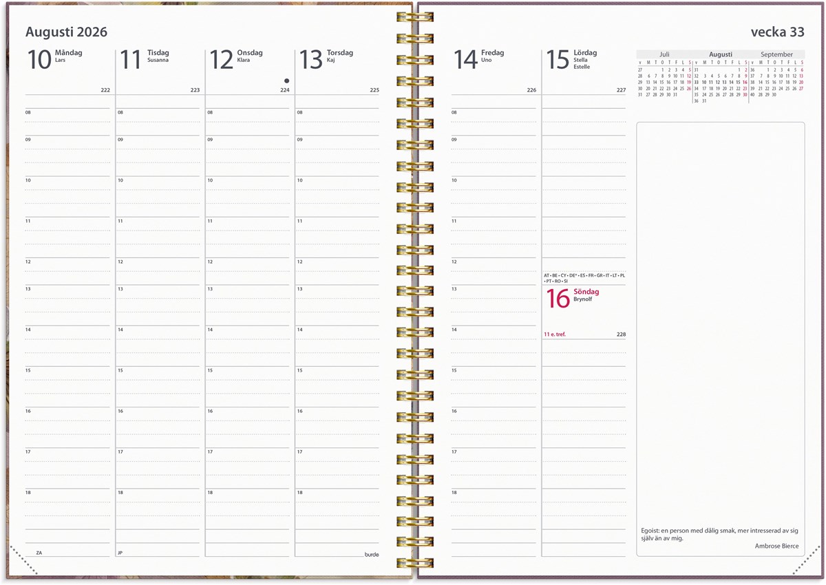 Format: A5. Layout: Stående. Vecka/uppslag. Timindelning 8-18. Kalendarium: 2025-11-24 - 2027-01-03. Omslag: Kartong med struktur. Spiralbunden. Detaljer: Gummiband. Pappersficka. Innehåll: Kyrkliga helgdagar, Flaggdagar, Helgdagar/aftnar, Internationella helgdagar, Månfaser, Namnsdagar, Internationella helgdagar översikt, Temadagar/händelser, Årsöversikt/årsöversikter, Årsplan/årsplaner. Antal sidor: 128. Miljöinformation: FSC®.