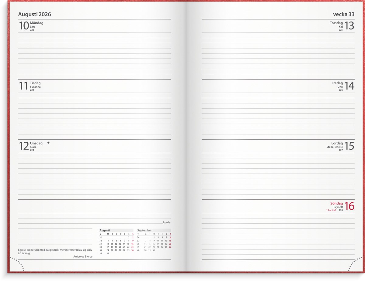 Format: 150x230 mm. Layout: Liggande. Vecka/uppslag. Kalendarium: 2025-12-22 - 2027-01-03. Omslag: Konstläder. Inbunden. Detaljer: Märkband. Innehåll: Kyrkliga helgdagar, Flaggdagar, Helgdagar/aftnar, Månfaser, Namnsdagar, Internationella helgdagar översikt, Temadagar/händelser, Årsöversikt/årsöversikter, Årsplan/årsplaner. Antal sidor: 128. Miljöinformation: FSC®.