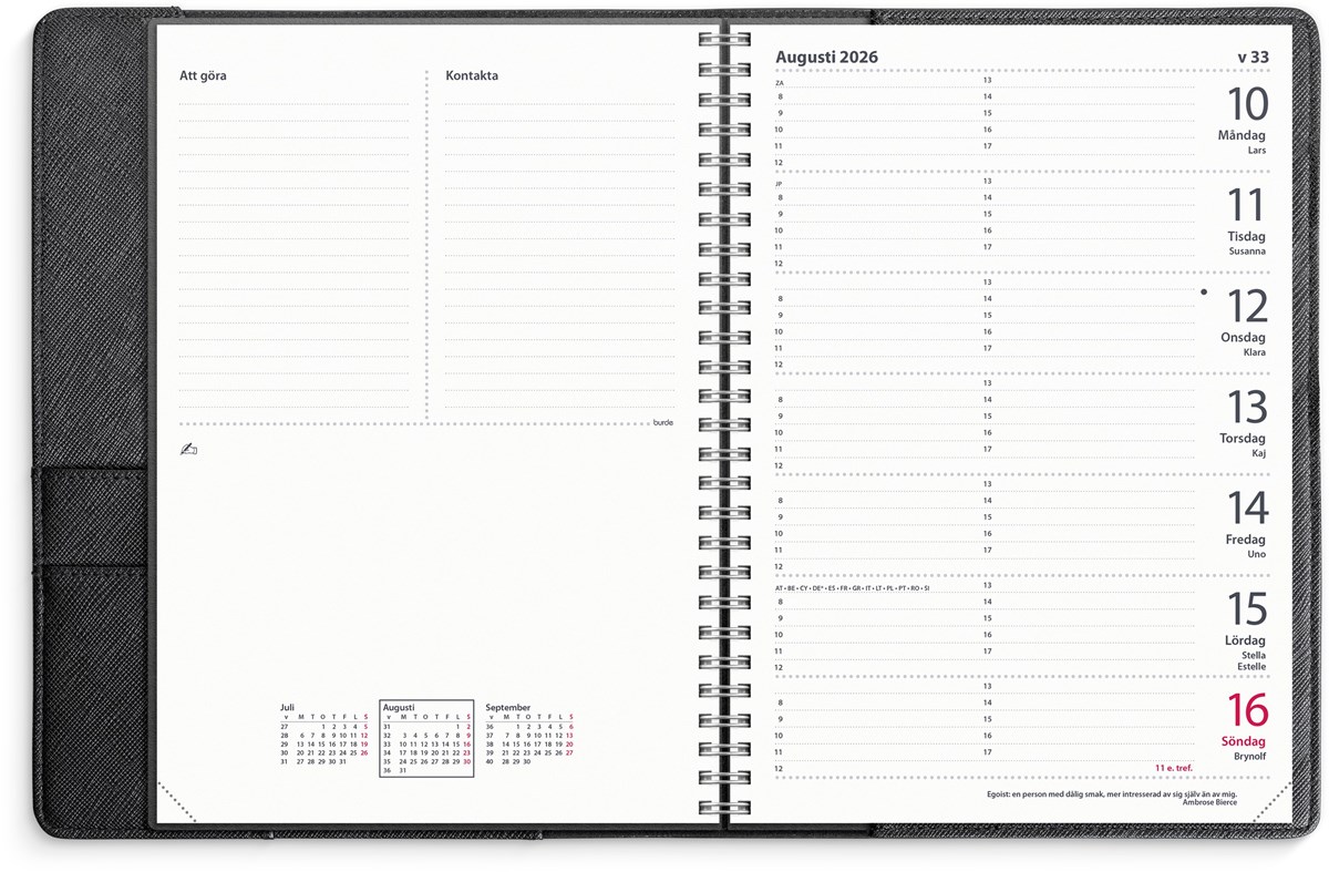 Format: A5. Layout: Liggande. Vecka/uppslag. Timindelning 8-17. Kalendarium: 2025-12-08 - 2027-01-03. Omslag: Konstläder. Spiralbunden. Detaljer: Flyttbar plastlinjal. Pappersficka. Innehåll: Kyrkliga helgdagar, Flaggdagar, Helgdagar/aftnar, Internationella helgdagar, Månfaser, Namnsdagar, Internationella helgdagar översikt, Temadagar/händelser, Årsöversikt/årsöversikter, Årsplan/årsplaner. Antal sidor: 160. Miljöinformation: FSC® papper.