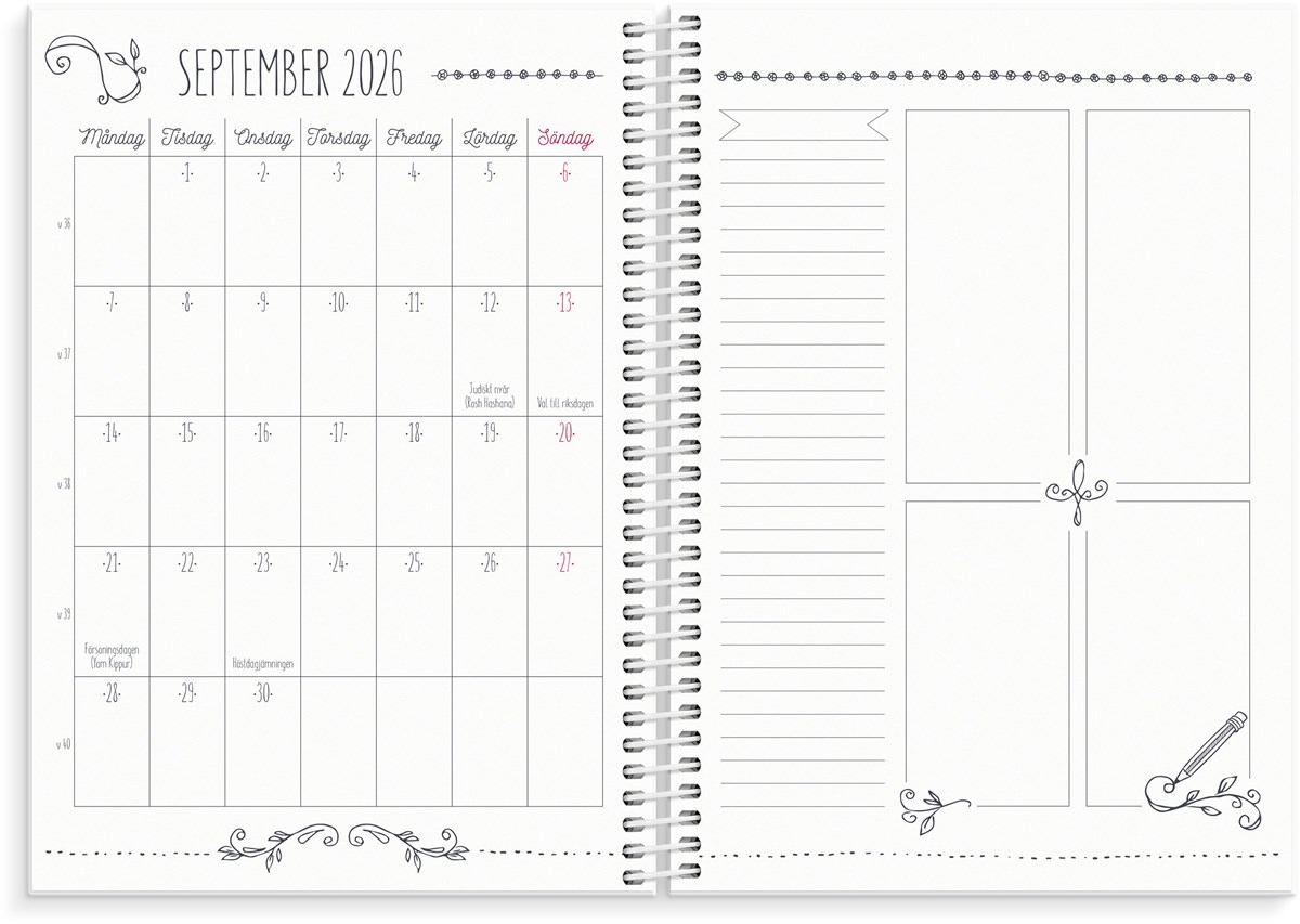 Låt din planering bli en kreativ och avkopplande paus! Det blir inspirerande att planera med din Doodle. Kalendern inleds med ett ark snygga stickers som du kan dekorera med efter känsla. Uppslagen med veckoplanering och månadsöversikt är lekfullt utformade och lämnar stort utrymme för dig att fylla med inspirerande färger, illustrationer och uppgifter. Kalendern har ett tjockare papper för att förhindra att pennor blöder igenom.