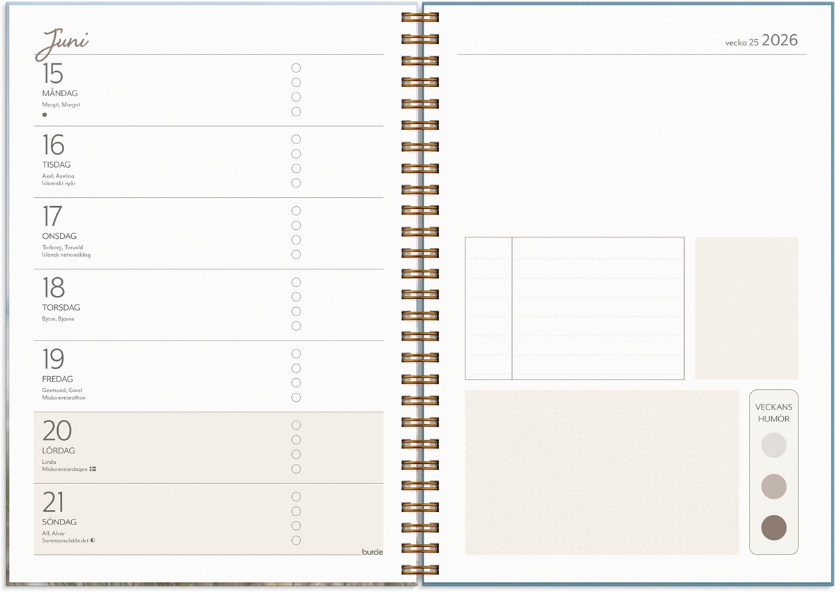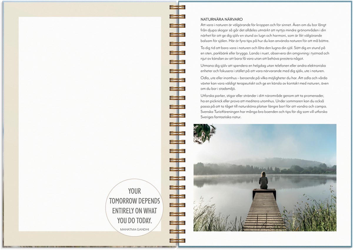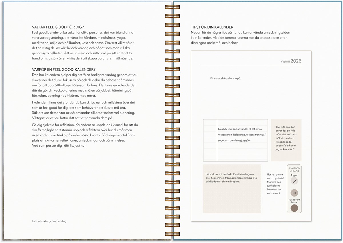 En kalender för den som vill få hjälp till en harmonisk vardag, balans mellan livet som pågår tillsammans med det som gör att du når välbefinnande; vardagsträning, yoga, meditation mm. Balans och välmående i fokus, inte så mycket resultat. Strukturerad veckoplanering med bra utrymme för planering och reflektioner. Bli inspirerad av positiva citat, stöttande texter och vackra bilder.