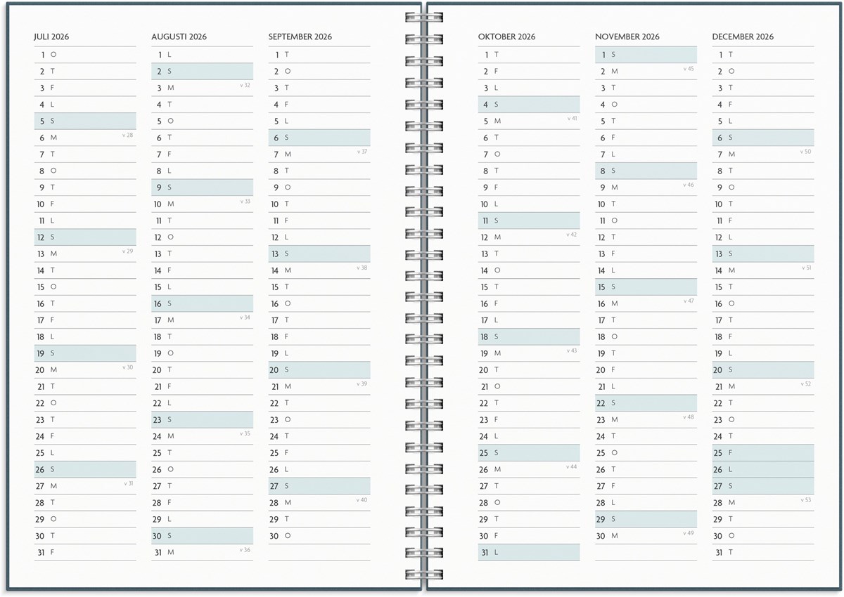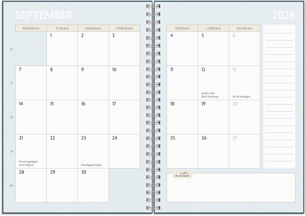 Format: A5. Layout: Liggande. Vecka/uppslag. Kalendarium: 2025-12-15 - 2027-01-03. Omslag: Kartong. Spiralbunden. Detaljer: Gummiband. Flyttbar plastlinjal. Pappersficka. Innehåll: Flaggdagar, Helgdagar/aftnar, Månfaser, Namnsdagar, Temadagar/händelser, Årsöversikt/årsöversikter, Årsplan/årsplaner. Antal sidor: 160. Miljöinformation: FSC®.