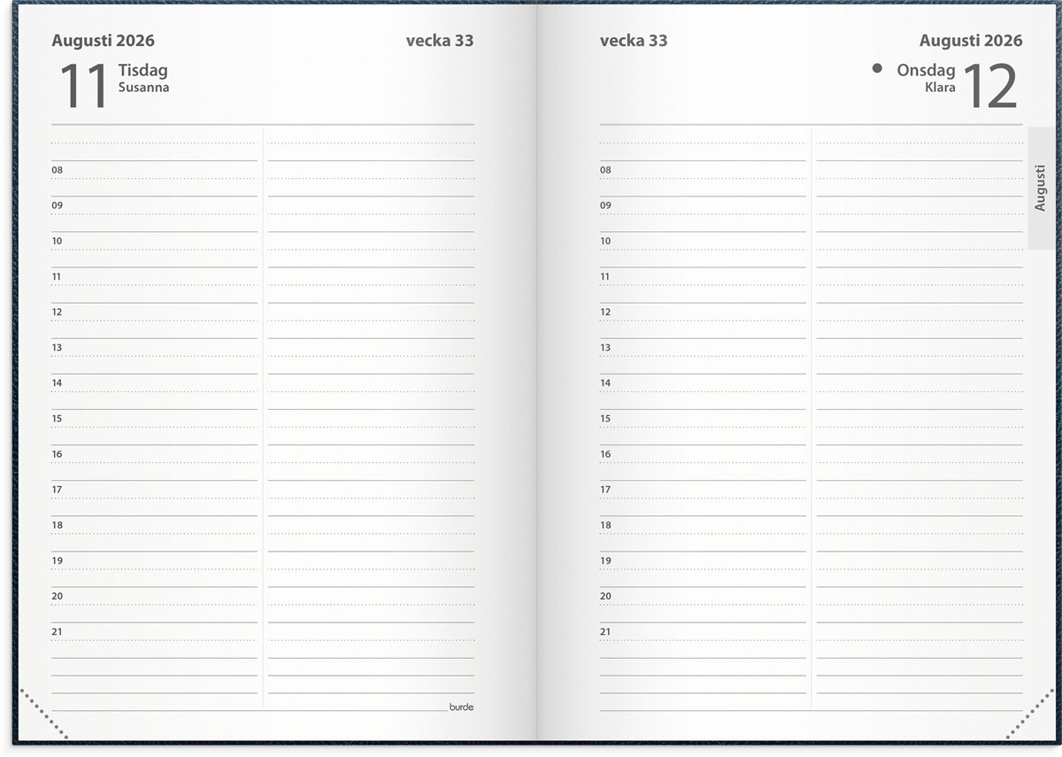 Format: A6. Layout: Dag/sida. Timindelning 8-21. Kalendarium: 2026-01-01 - 2026-12-31. Omslag: Konstläder. Inbunden. Innehåll: Kyrkliga helgdagar, Flaggdagar, Helgdagar/aftnar, Månfaser, Namnsdagar, Internationella helgdagar översikt, Temadagar/händelser, Årsöversikt/årsöversikter, Årsplan/årsplaner. Antal sidor: 400. Miljöinformation: FSC®.