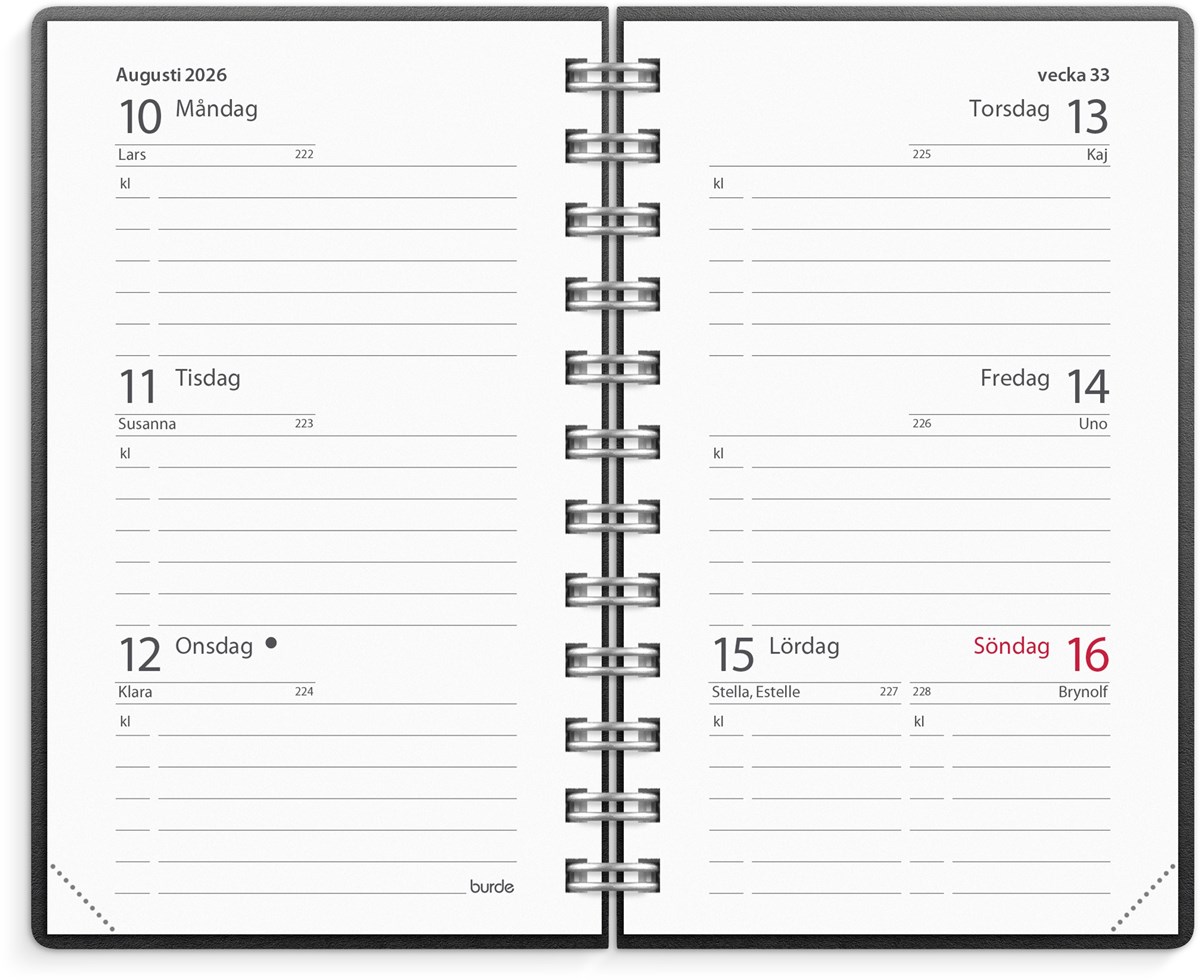 Format: 63x107 mm. Layout: Liggande. Vecka/uppslag. Kalendarium: 2025-11-10 - 2027-01-03. Omslag: Återvunnen kartong. Spiralbunden. Innehåll: Flaggdagar, Helgdagar/aftnar, Månfaser, Namnsdagar, Internationella helgdagar översikt, Telefonregister, Temadagar/händelser, Årsöversikt/årsöversikter. Antal sidor: 160. Miljöinformation: FSC®. Omslag i återvunnen kartong. Tillverkad i Småland.