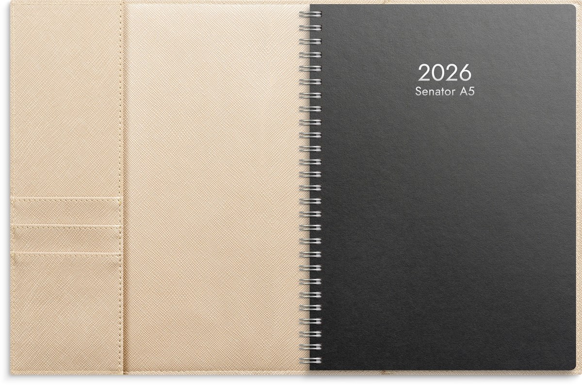 Format: A5. Layout: Liggande. Vecka/uppslag. Kalendarium: 2025-12-08 - 2027-01-03. Omslag: Konstläder. Spiralbunden. Innehåll: Kyrkliga helgdagar, Flaggdagar, Helgdagar/aftnar, Månfaser, Namnsdagar, Temadagar/händelser, Årsöversikt/årsöversikter, Årsplan/årsplaner. Antal sidor: 144. Miljöinformation: FSC® papper.