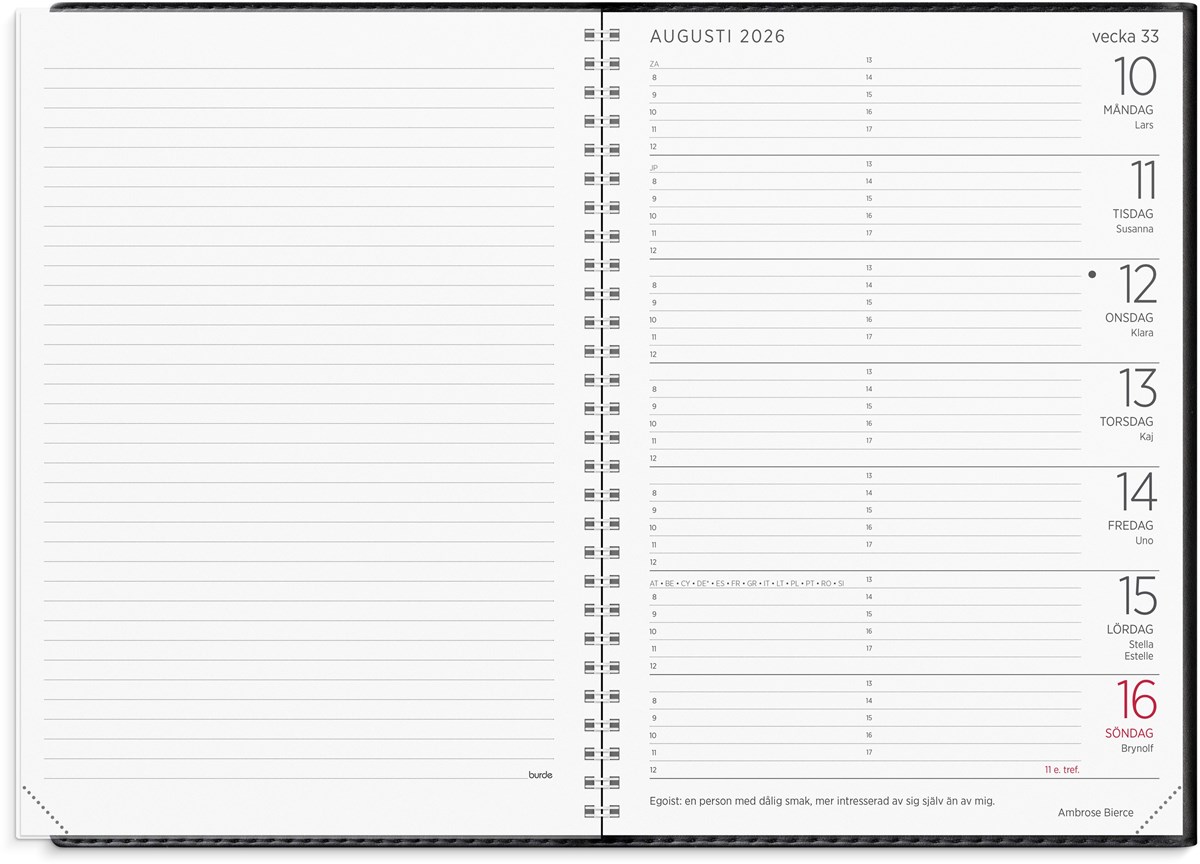Format: A5. Layout: Liggande. Vecka/uppslag. Timindelning 8-17. Kalendarium: 2025-12-22 - 2027-01-03. Omslag: Konstläder. Spiralbunden. Innehåll: Kyrkliga helgdagar, Flaggdagar, Helgdagar/aftnar, Internationella helgdagar, Linjerade vänstersidor, Månfaser, Namnsdagar, Internationella helgdagar översikt, Löst telefonblad, Temadagar/händelser, Årsöversikt/årsöversikter, Årsplan/årsplaner. Antal sidor: 112. Miljöinformation: FSC®.
