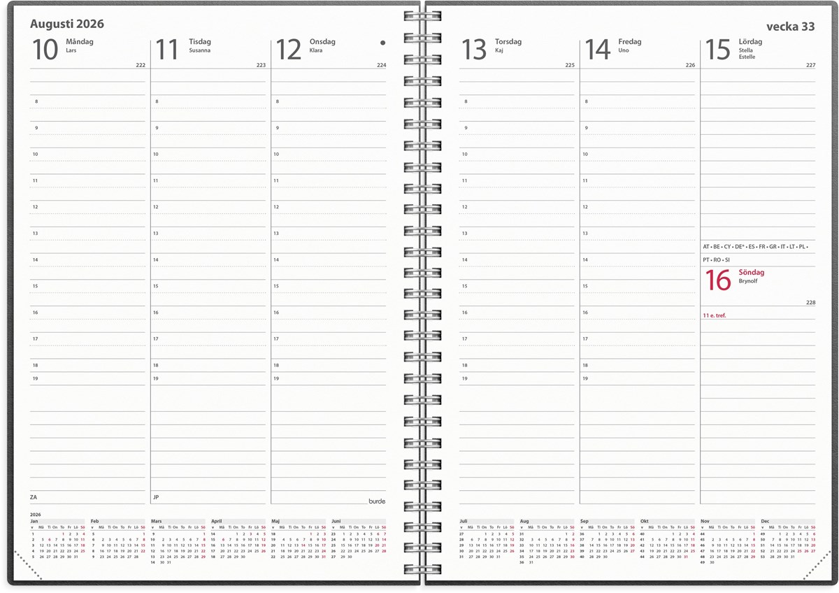 Format: A5. Layout: Stående. Vecka/uppslag. Timindelning 8-19. Kalendarium: 2025-12-08 - 2027-01-03. Omslag: Konstläder. Spiralbunden. Innehåll: Kyrkliga helgdagar, Flaggdagar, Helgdagar/aftnar, Internationella helgdagar, Månfaser, Namnsdagar, Internationella helgdagar översikt, Temadagar/händelser, Årsöversikt/årsöversikter, Årsplan/årsplaner. Antal sidor: 144. Miljöinformation: FSC® papper.