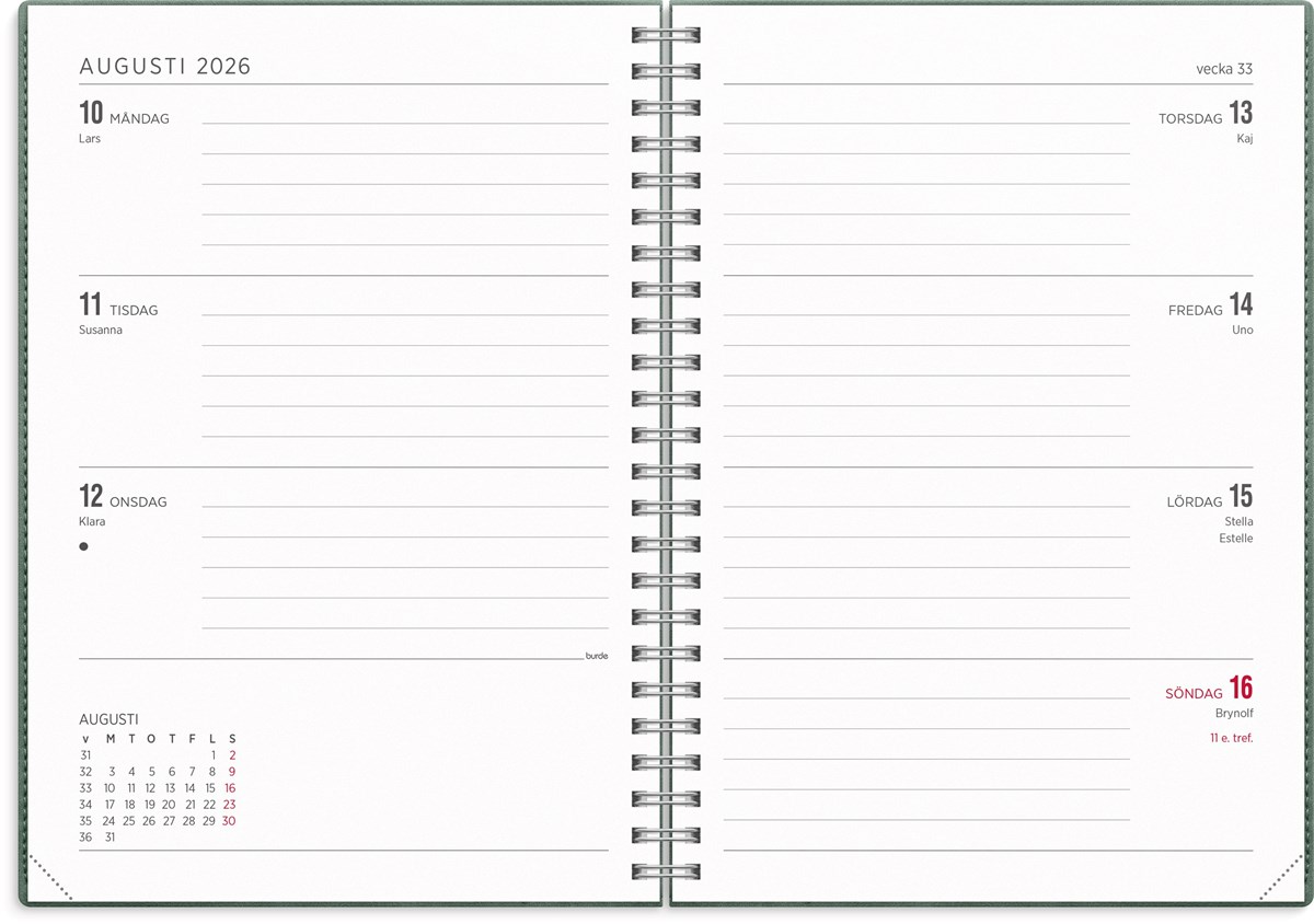 Format: A5. Mått: 17 x 215 x 163 mm. Layout: Vecka/uppslag. Liggande. Kalendarium: 2026-06-01 - 2027-07-04. Omslag: Konstläder. Spiralbunden. Innehåll: Flaggdagar, helgdagar/aftnar, månfaser, namnsdagar, temadagar/händelser, årsöversikt/årsöversikter, årsplan/årsplaner. Antal sidor: 144. Miljöinformation: FSC® papper.