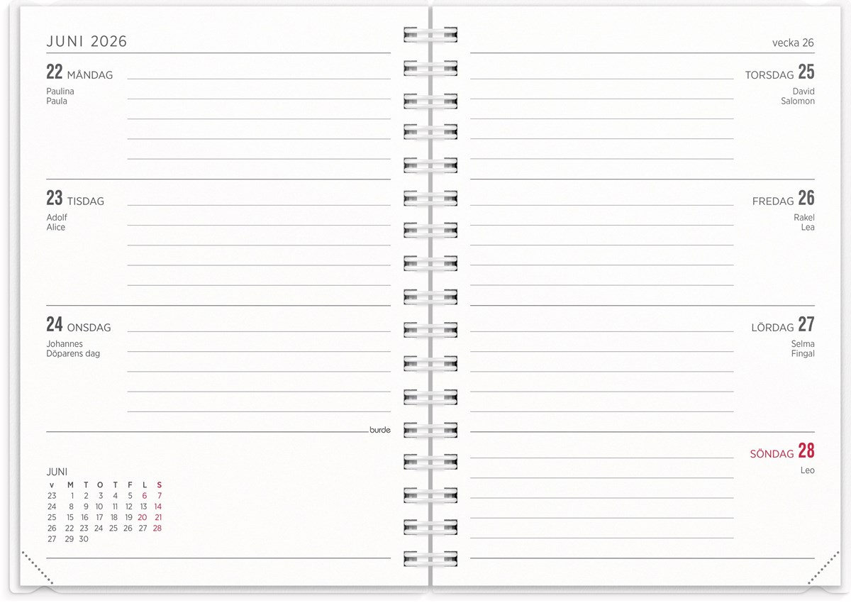 Format: A6. Mått: 156 x 17 x 120 mm. Layout: Vecka/uppslag. Liggande. Kalendarium: 2026-06-01 - 2027-07-04. Omslag: PP-plast och plastficka med tryckt blad. Spiralbunden. Detaljer: Gummiband. Innehåll: Flaggdagar, helgdagar/aftnar, månfaser, namnsdagar, temadagar/händelser, årsöversikt/årsöversikter, årsplan/årsplaner. Antal sidor: 144. Miljöinformation: FSC®.