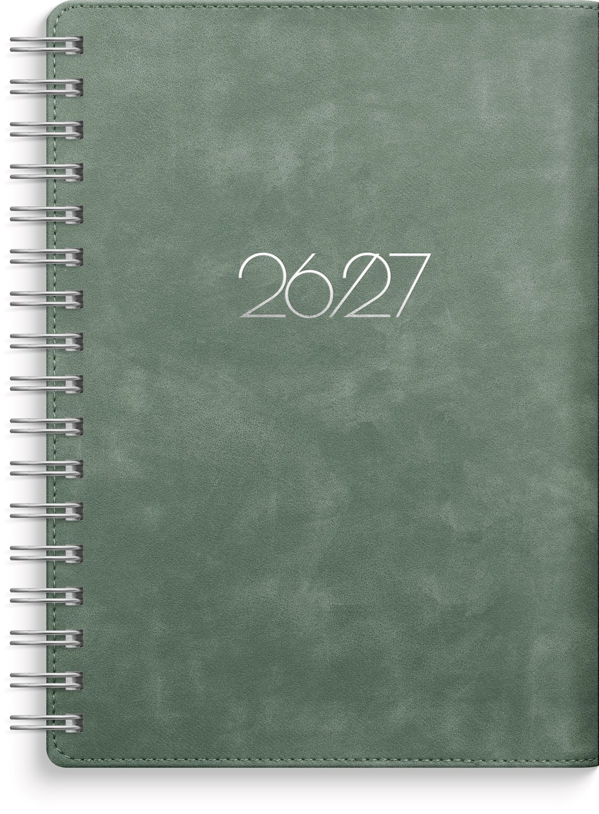 Format: A6. Mått: 110 x 15 x 175 mm. Layout: Vecka/uppslag. Liggande. Kalendarium: 2026-06-01 - 2027-07-04. Omslag: Konstläder. Spiralbunden. Innehåll: Flaggdagar, helgdagar/aftnar, månfaser, namnsdagar, temadagar/händelser, årsöversikt/årsöversikter, årsplan/årsplaner. Antal sidor: 144. Miljöinformation: FSC® papper.